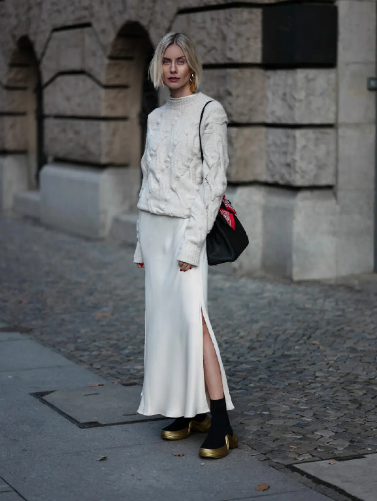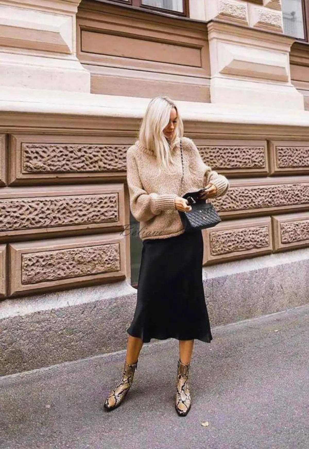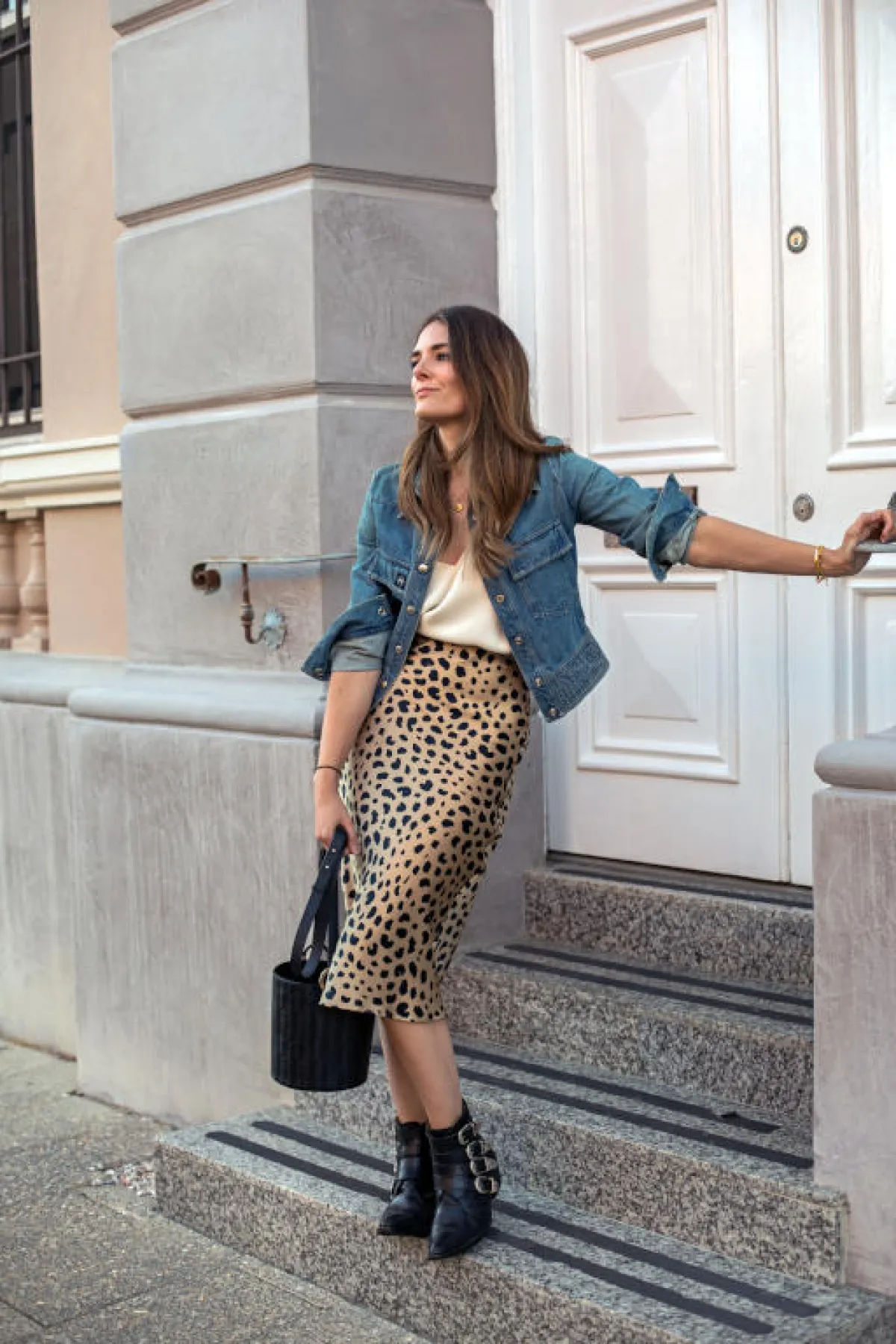 أفضل ما في الأمر هو أنّ التنورة الميدي متعددة الاستخدامات وسهلة الارتداء. ارتديها بقصة محبوكة من الخصر مع البلوزات الصيفية المربوطة من الأمام. أما في الجو البارد، فيمكنكِ تنسيقها مع كنزة صوفية وحذاء البوت برقبة عالية تظهر من الشق الأمامي على سبيل المثال.