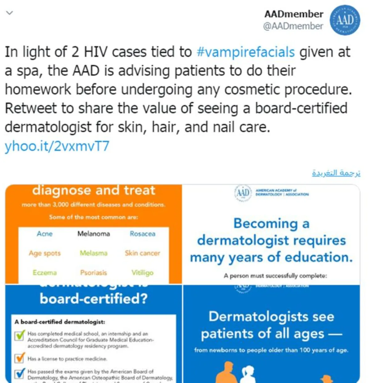 بعد رصد حالات لسيدات أصبن بمرض نقص المناعة «الإيدز» بسبب حقن البلازما في الوجه، أصدرت الجمعية الأمريكية للأمراض الجلدية بياناً عبر التويتر، وضحت فيه: «على ضوء حالتين أصيبتا بفيروس العوز المناعي الإيدز، بسبب حقن البلازما في أحد المنتجعات، ننصح بالانتباه قبل الخضوع لأي إجراء جراحي».