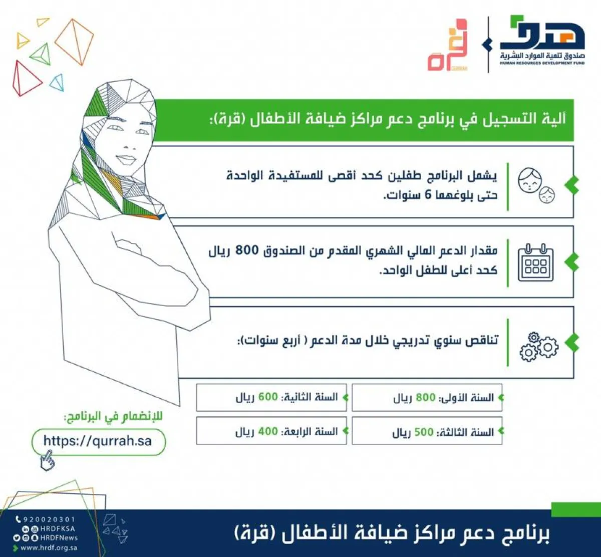 ومن جهة أخرى أتاح صندوق تنمية الموارد البشرية «هدف» للسعوديات الراغبات في إلحاق أبنائهن في مراكز الحضانة الرابط الإلكتروني: https://qurrah. sa. يمكنهن زيارته والاطلاع على تفاصيل البرنامج والتسجيل فيه والاستفادة من الدعم المالي الذي يقدمه البرنامج.