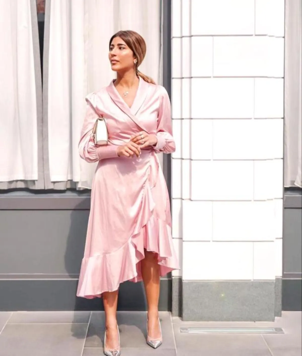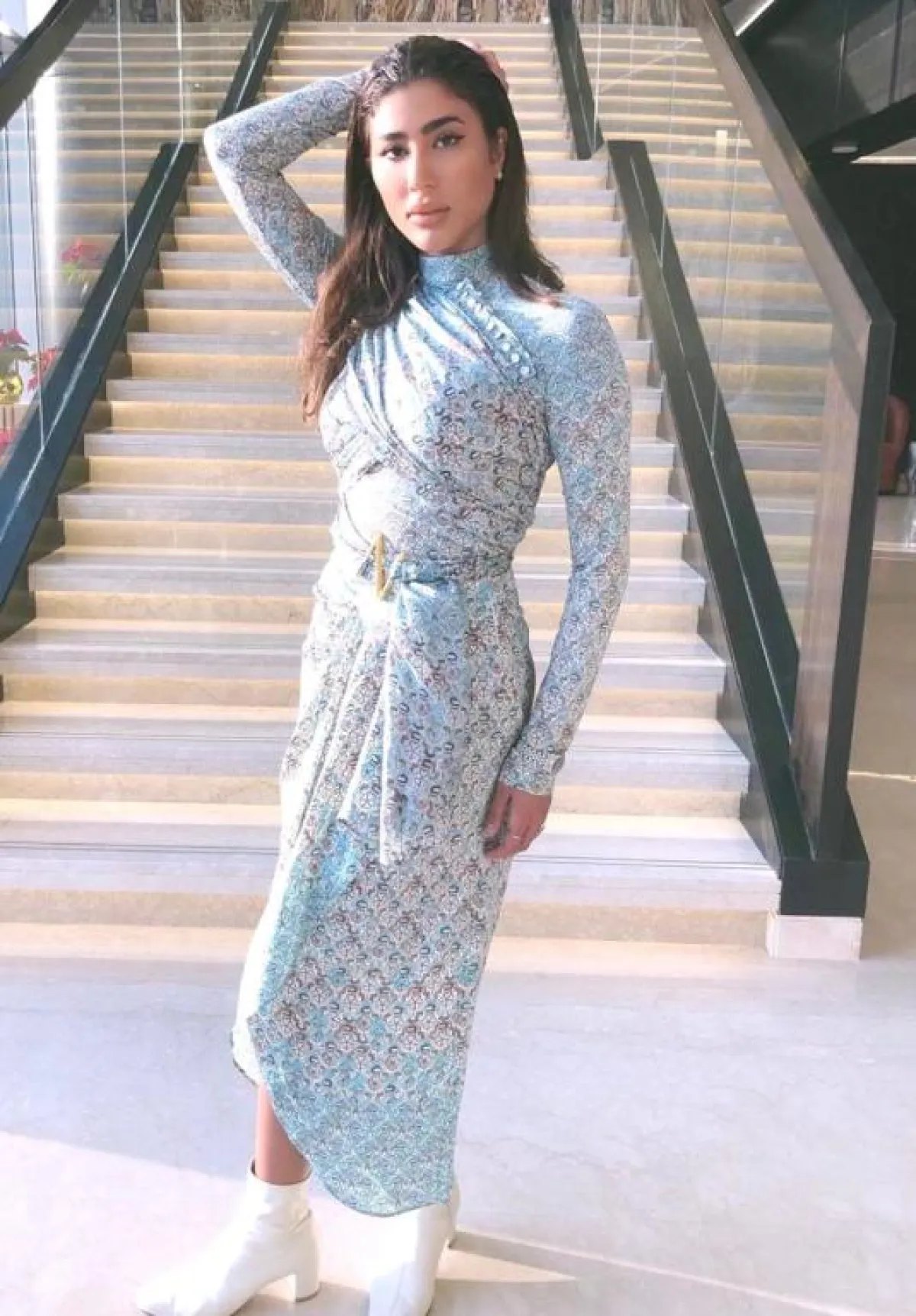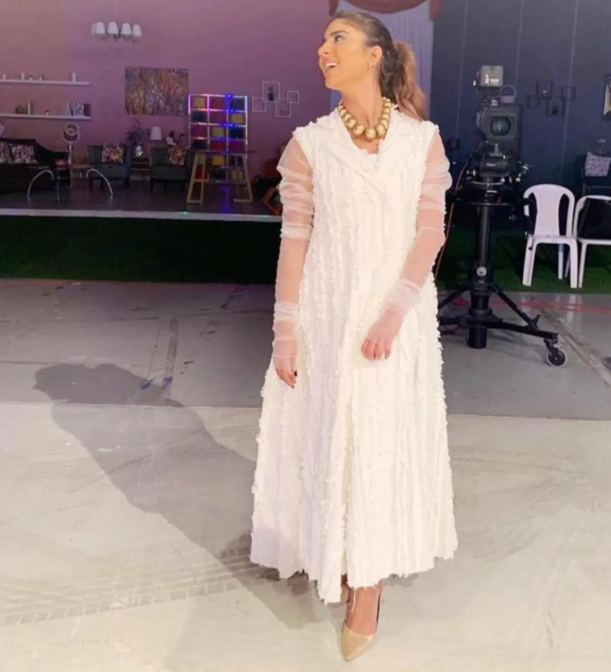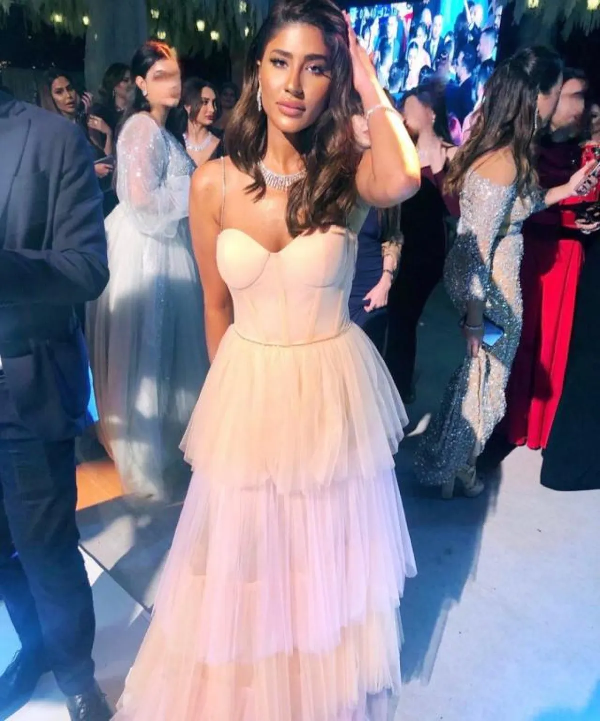 عن الفساتين، تألقت بفستان أزرق ضيق بنقوش وقصة مميزة، وتميزت بفستان زهري بطبقات من الكشكشة، وتجملت بفستان زهري قصير بأكمام طويلة وقصة مميزة من الأسفل، وزينها فستان أحمر قصير وضيق مزين بكشكشة في الأكمام والأسفل، واختارت فستانًا أبيض بأكمام شفافة مميزة وبقماش مميز للفستان.