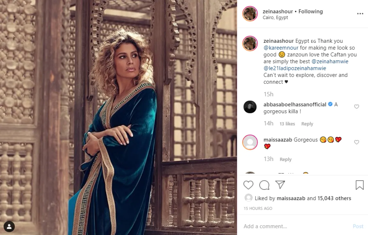 كشفت زينة عاشور الزوجة الرسمية الثانية للنجم عمرو دياب عن تواجدها في القاهرة، بجلسة تصوير بملابس شرقية بعدسة مصور دياب كريم نور، الذي قام سابقا بعمل جلستي تصوير للنجمة دينا الشربيني، وحرصت زينة على توجيه الشكر لكريم لأنه جعلها تبدو بأفضل صورة ممكنة حسب وصفها، كما وجهت الشكر لمصممة القفطان.