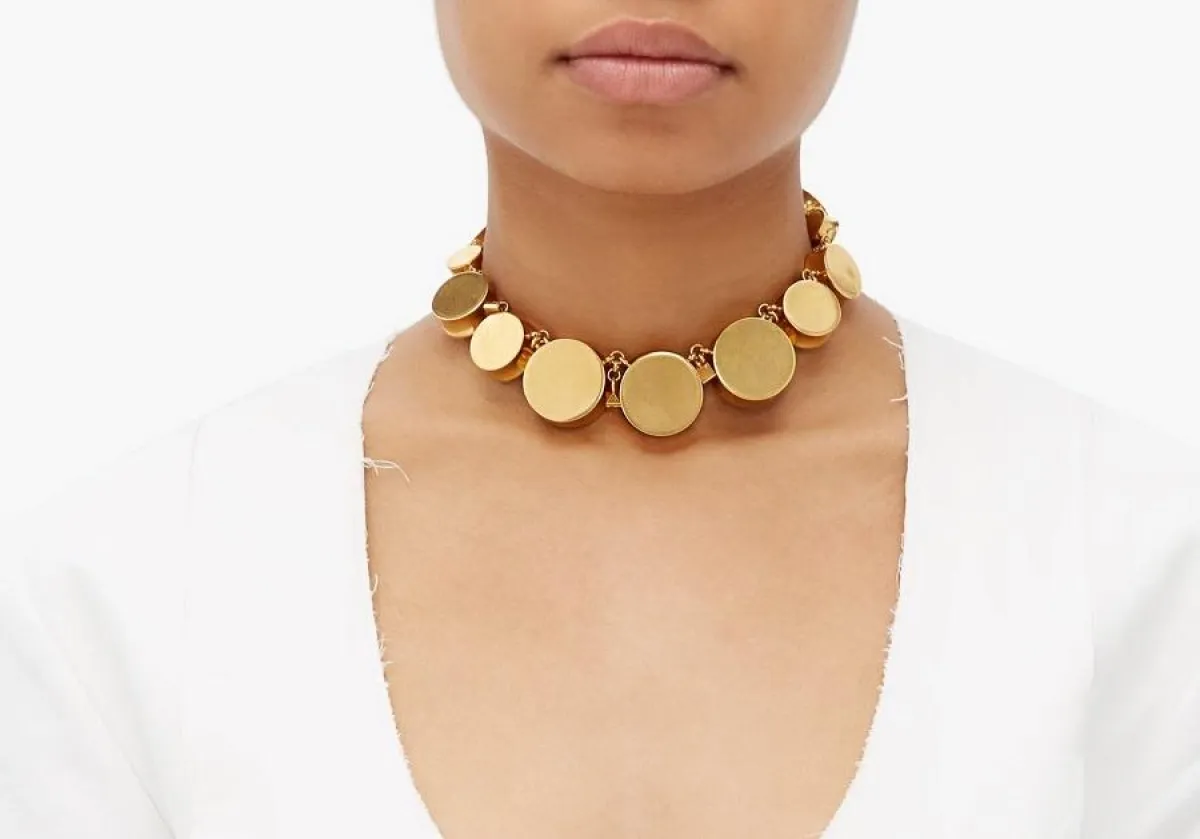 في حين برزت القلادة الضيقة من Valentino بتصميم بسيط، حيث تألفت من عدد من الدوائر الذهبية المرصوفة بجانب بعضها البعض بأسلوب بسيط.