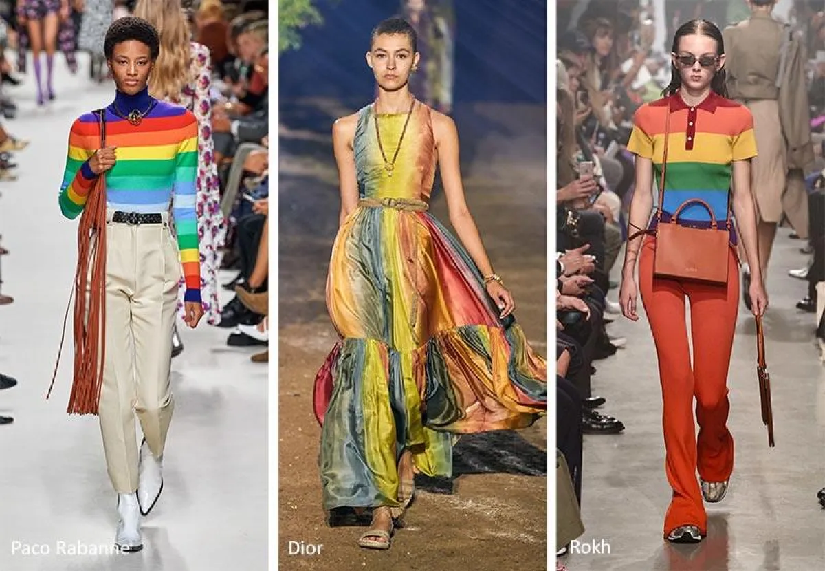 وقد قدمت عدد من دور الأزياء من خلال مجموعتها هذه الصيحة بشكل جذاب من بينهم دار "Dior" التي قدمت فستان بالكامل من ألوان قوس قزح مدرجة، كذلك دار "Paco Rabanne" التي قدمت تي شيرت بأكمام طويلة وياقة عالية مخطط بألوان قوس قزح أفقيا، مع بنطال باللون الكاكي بوسط مرتفع، لنذهب معه عبر الزمان إلى السبعينات حيث كان يتم اعتماد هذه الإطلالات بين فتيات الجامعة.