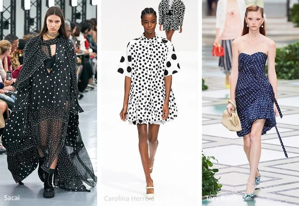 مثل فستان "Carolina Herrera" التي تنوع بين النقاط السوداء الكبيرة والصغيرة على خلفية بيضاء، وفستان "Sacai" بنقاطه الصغيرة والأكثر صغرا من الأبيض على خلفية سوداء، إلى جانب فستان "Tory Burch" الكحلي بالنقاط البيضاء الدقيقة.