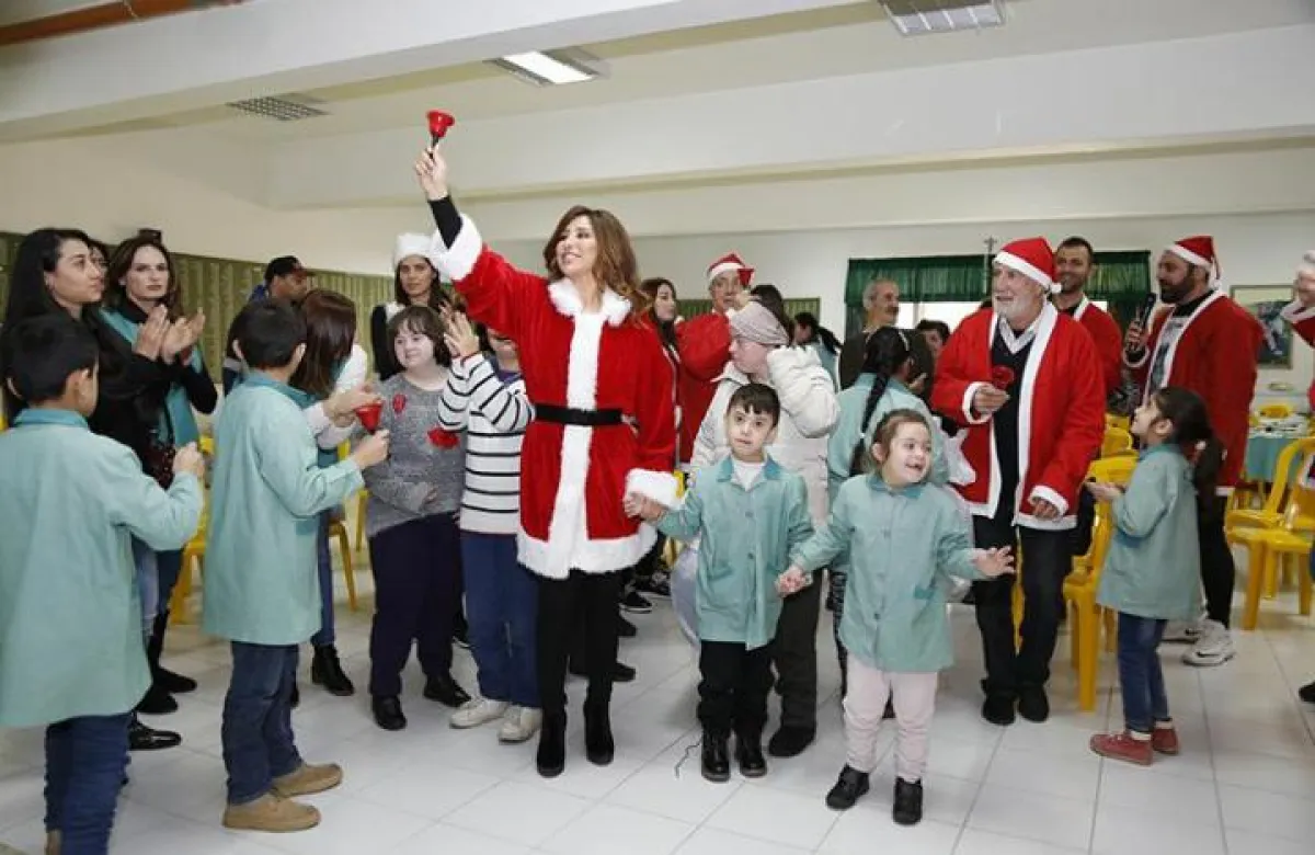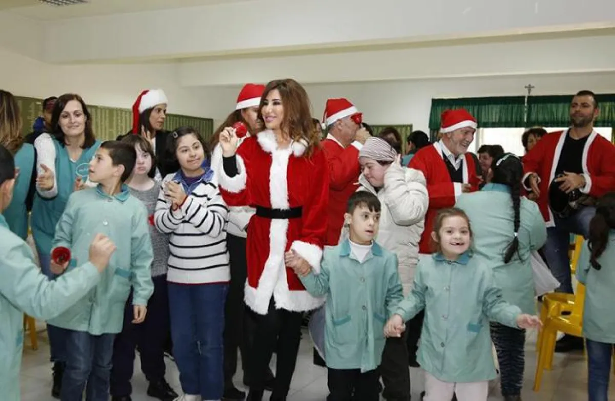 نجوى كرم دخلت على الأطفال بزي ماما نويل، وغنت للأطفال ورقصت معهم وقدمت لها الهداية في محاولة منها لزيارة البسمة على ثغورهم.