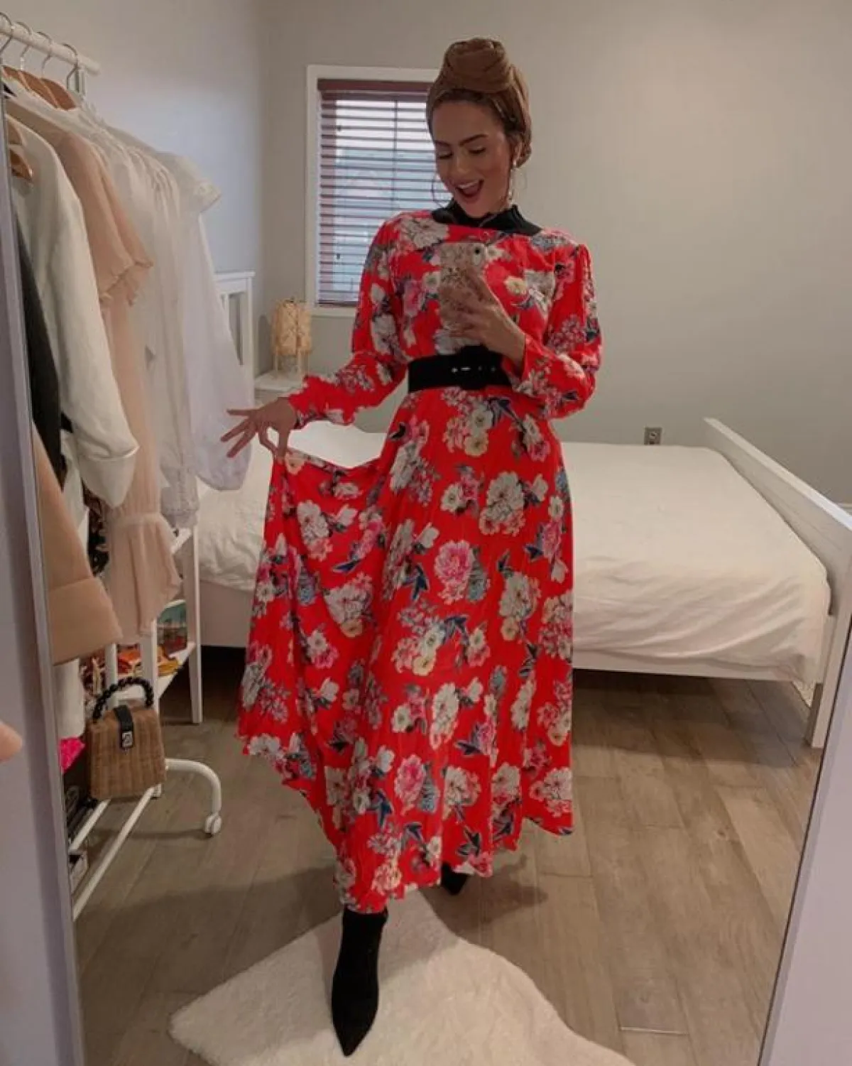 للمناسبات السريعة في المساء، وتفضلين فيها اعتماد الفساتين، فأفضل ما يمكنك اختياره هو الفساتين المطبعة بالورود، والتي تربعت على عرش الموضة في 2020، وتناسب كل المواسم، كهذا الفستان الذي اعتمدته الفاشينيستا ظهيرة مع بوت الساق لاطلالة شتوية من الدرجة الأولى.