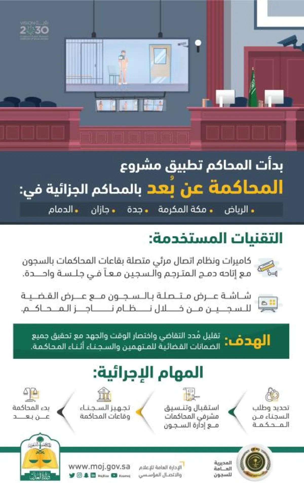 أعلنت وزارة العدل تفعيل مشروع المحاكمة عن بُعد في 5 محاكم و5 سجون، بعد الانتهاء من المتطلبات التقنية والإجرائية للخدمة، وذلك بهدف سرعة النظر في قضايا السجناء وتسهيل إجراءات التقاضي وسرعة البت في قضاياهم.