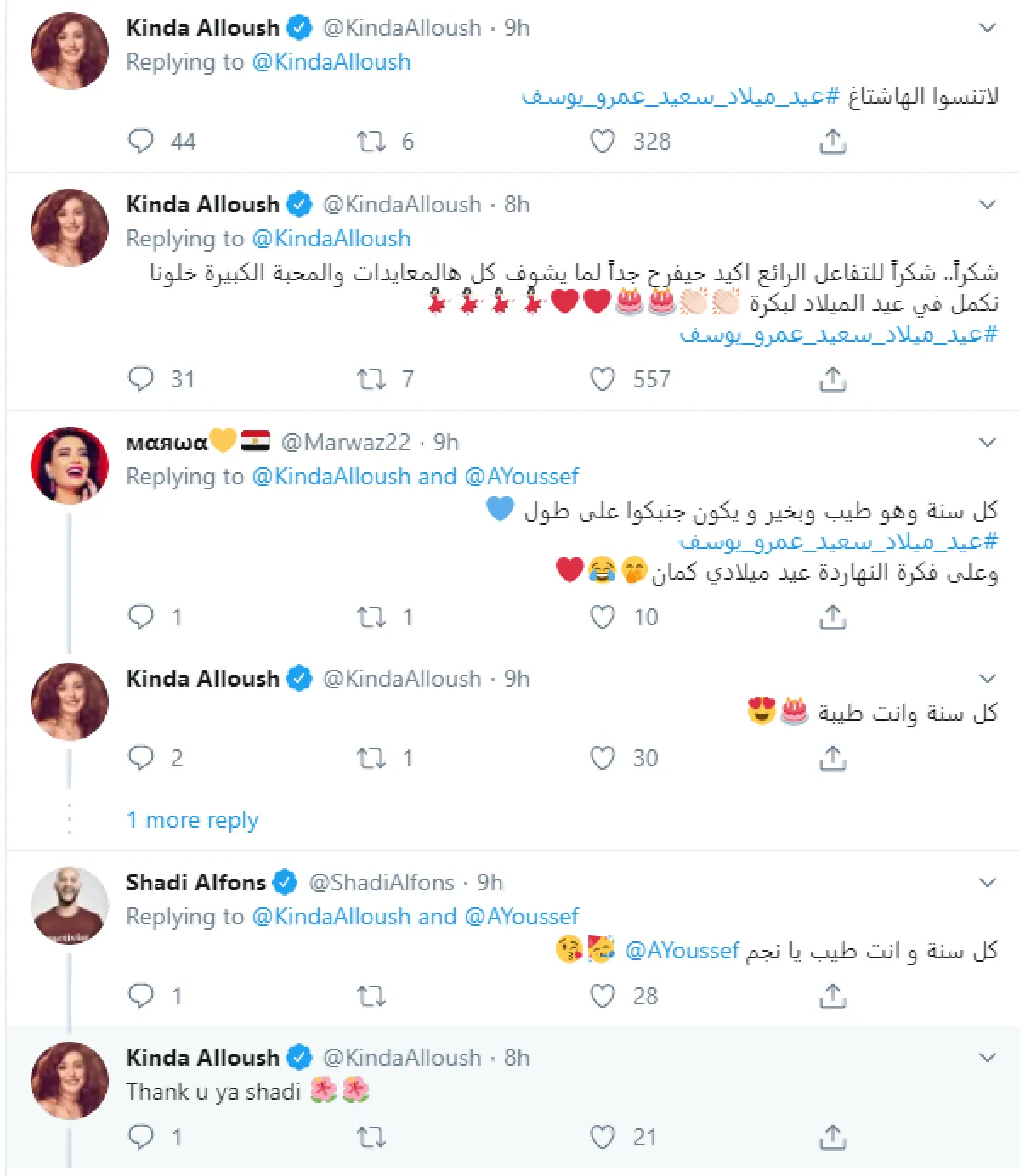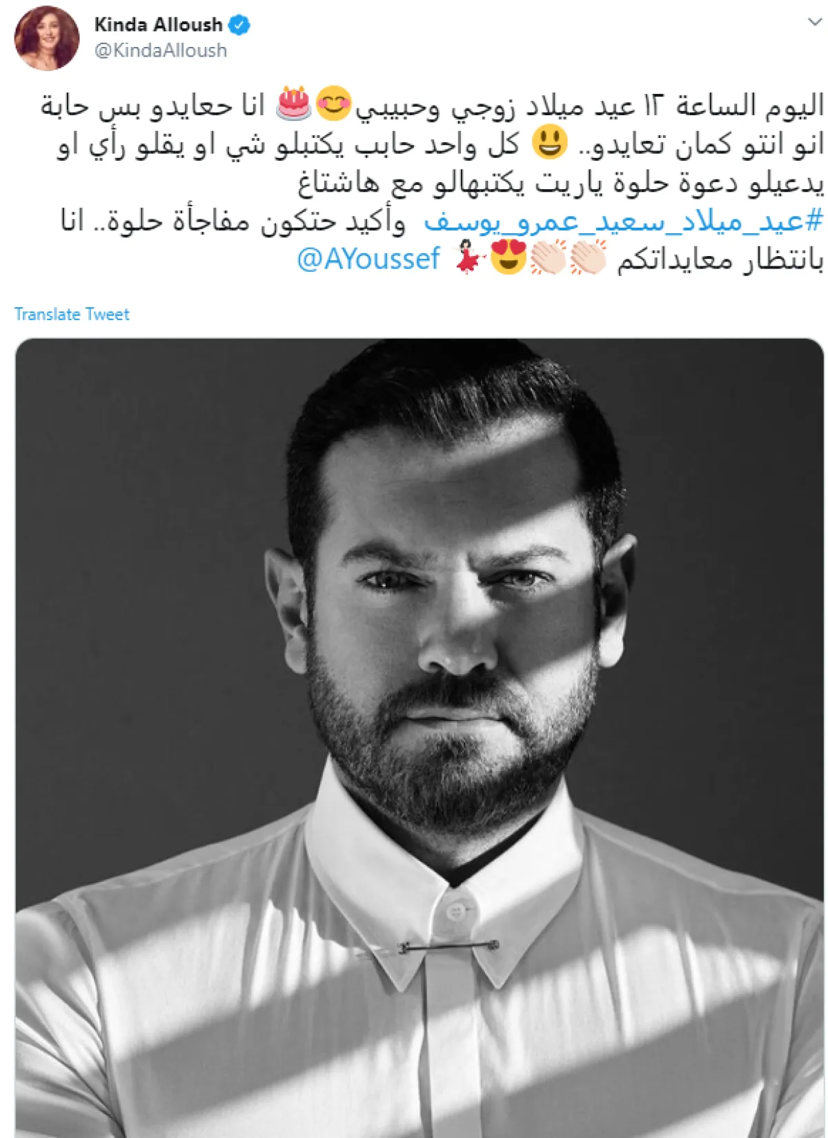 كندة نشرت عبر حسابها الشخصي بموقع تويتر، صورة لزوجها النجم عمرو يوسف وعلقت على الصورة قائلة: اليوم الساعة 12 عيد ميلاد زوجي وحبيبي، انا حعايدو بس حابة انو انتو كمان تعايدو، كل واحد حابب يكتبلو شي او يقلو رأي او يدعيلو دعوة حلوة ياريت يكتبهالو مع هاشتاغ #عيد ميلاد سعيد عمرو يوسف، وأكيد حتكون مفاجأة حلوة، انا بانتظار معايداتكم.