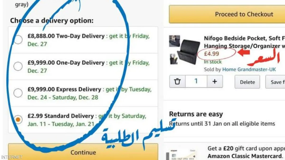 وتابع الموقع البريطاني، أن الذهول والصدمة أصابت المتسوق، عندما لاحظ بأن طلبيته التي تبلغ بضعة جُنيهات فقط، تكلفة تسليمها في حال أراد أن تصله يوم الجمعة 27 ديسمبر، سوف تكون 8 آلاف و888 جنيهاً إسترلينياً، أما إن أراد شراءها واستلامها باليوم نفسه، فإن تكلفتها سوف تصل إلى 9 آلاف 999 جنيهاً إسترلينياً. وعلى الفور، قام المتسوق بالتقاط صورة لعملية الشراء والتسليم الغريبة، ونشرها على التواصل الاجتماعي.