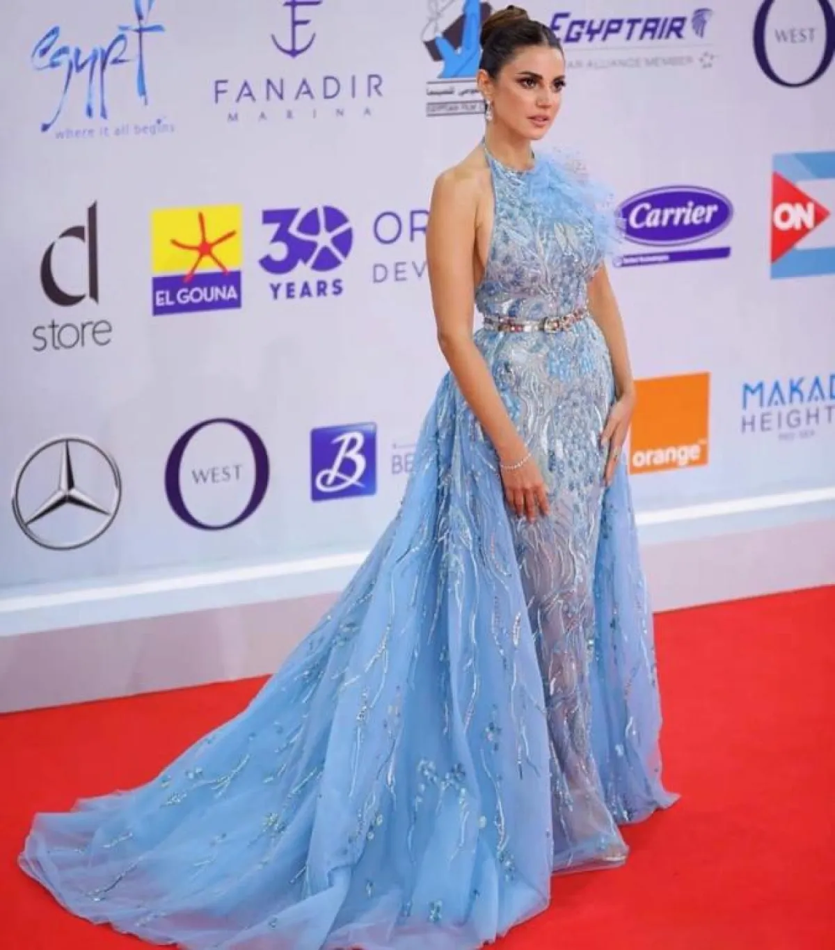 إحدى أجمل إطلالات درة زروق لهذا العام في فستان باللون الأزرق مصنوع من قماش الشيفون المطرز بالخرز والكريستال البراق، بقصة فاخرة من دون أكمام ومحدد الخصر بحزام باللون الفضي الميتالك، مزين بكشكش ناعم عند الياقة وله ذيل طويل، وقد اختارت معه مجوهرات ماسية ناعمة.