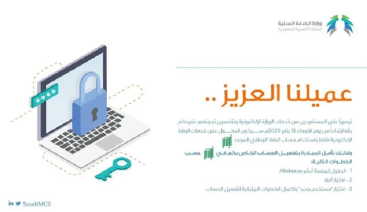كشفت وزارة الخدمة المدنية، عبر حسابها الرسمي على موقع التواصل الاجتماعي "تويتر"، إنه ابتداءً من 15 يناير 2020 سيكون الدخول إلى جميع خدمات الوزارة الإلكترونية عبر خدمة النفاذ الموّحد "أبشر".