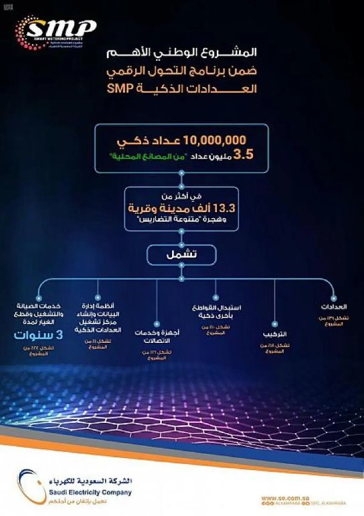 وتنطلق مطلع فبراير 2020 عمليات تركيب العدادات الالكترونية الذكية، ضمن العقد الذي وقعته "السعودية للكهرباء"، بعد موافقة مجلس إدارة الشركة على ترسية المشروع، الذي يشمل تركيب 10 ملايين عداد ذكي لجميع المشتركين في المملكة، بتكلفة إجمالية تبلغ 9,555,099,334 ريالا سعوديا، ولا يقتصر مشروع العدادات الذكية الذي وقعته الشركة على تركيب العدادات فقط، ولكنه يشمل دعماً كاملاً للبنية التحتية التي يحتاجها المشروع، مثل تغيير القواطع الكهربائية القديمة، وأعمال الصيانة لمدة ثلاث سنوات تعقب انتهاء أعمال التركيب، إضافة إلى المواصفات الفنية العالية التي اشترطتها الشركة في جميع مكونات العداد الذكي التي تضاهي أرقى المواصفات ومعايير الجودة العالمية.