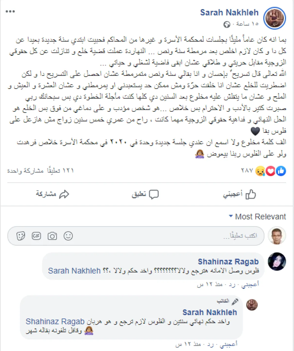 سارة نخلة رغم حسم كل الدعاوى المتبادلة بينها وبين زوجها أمام القضاء لصالحها، أكدت أنها لم تعد قادرة على مواصلة طريق المحاكم والأزمات، وأضافت عبر حسابها الخاص على موقع الفيس بوك: بما إنه كان عامًا مليئًا بجلسات لمحكمة الأسرة وغيرها من المحاكم، فحبيت ابتدي سنة جديدة بعيدًا عن كل دا،  وكان لازم أخلص بعد مرمطة سنة ونص، النهاردة عملت قضية خلع وتنازلت عن كل حقوقي الزوجية مقابل حريتي وطلاقي عشان أبقى فاضية لشغلي وحياتي.