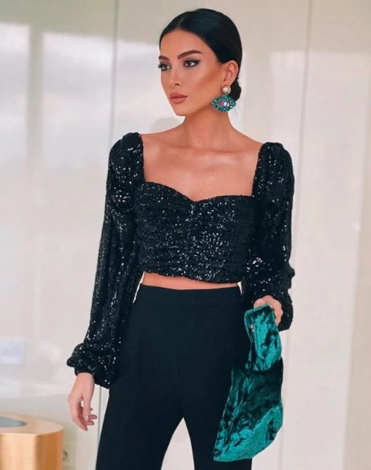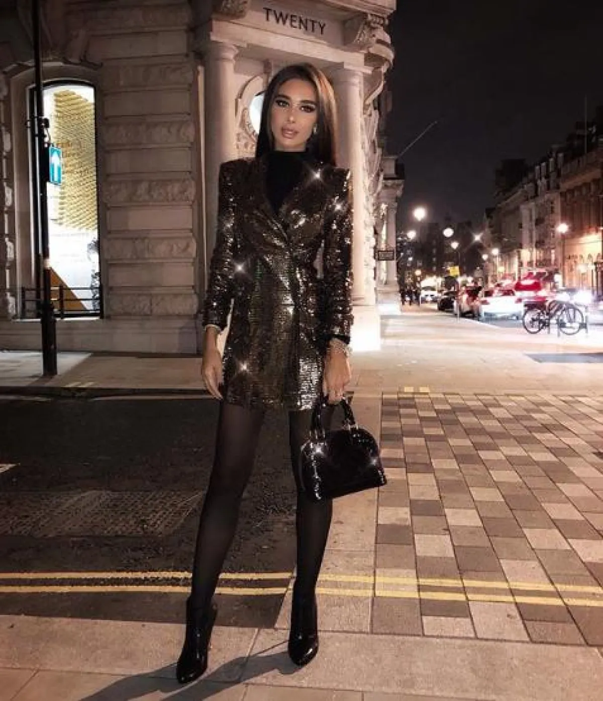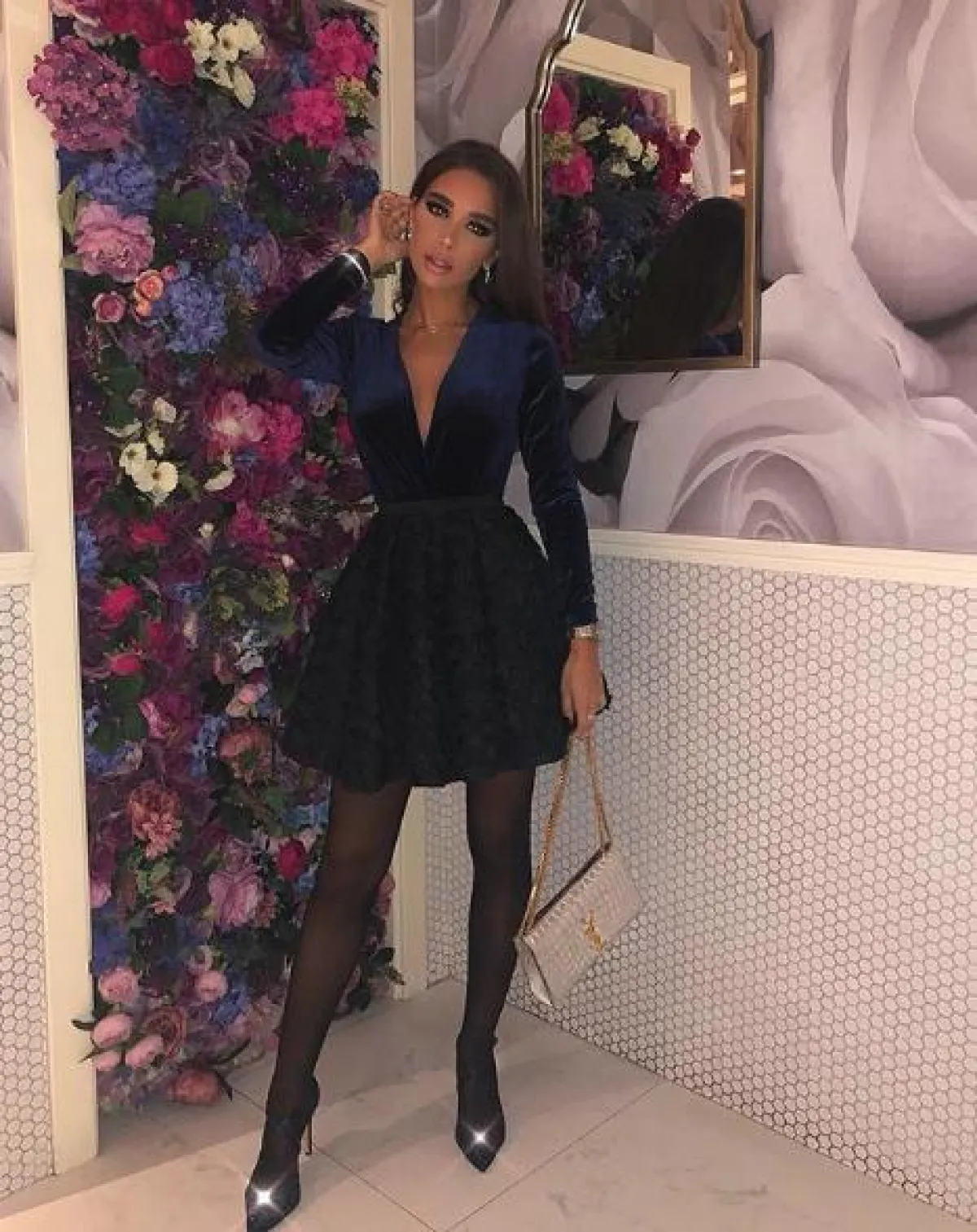 اطلالة ناعمة نسقتها مرام زبيدة تستطيعين أن تستوحي منها فكرة مميزة للكريسماس، وكانت عبارة عن فستان قصير من المخمل باللون الأزرق الداكن، ياقته من الأعلى مفتوحة على شكل حرف V، أكمامه طويلة وخصره محدد، أما تنورته كلوش يصل طولها أعلى حد الركبة، وقد نسقت معه حذاءً أنيقًا بكعب عالٍ وحقيبة كتف باللون الفضي الميتالك من سانت لوران Saint Laurent.