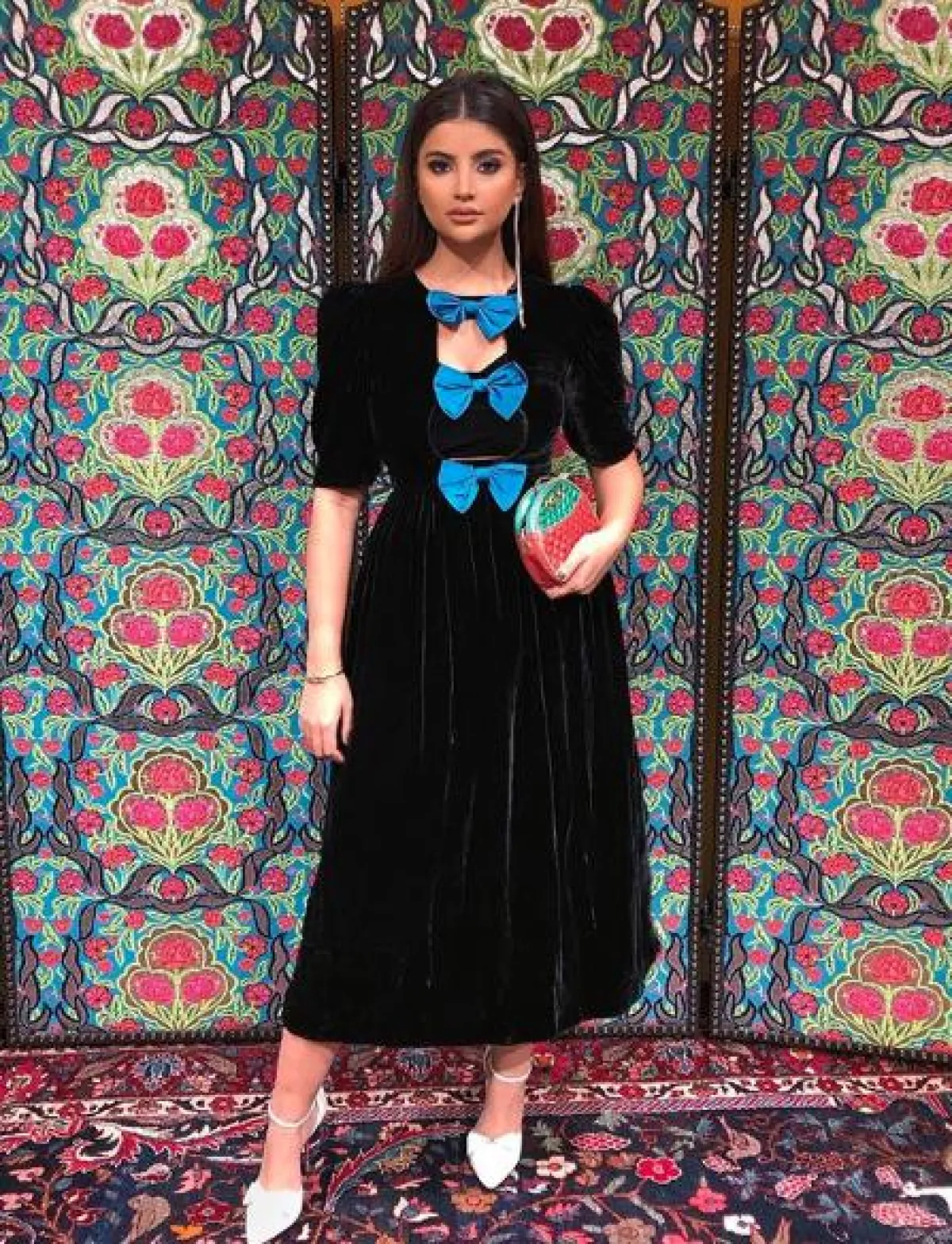 اطلالة مميزة رصدناها لـ علا فرحات مؤخرًا بدت فيها غاية في الأناقة، وقد اختارت فستان ميدي من المخمل باللون الأسود من غوتشي Gucci، تصميمه أنثوي مزين عند الصدر بشرائط من الساتان باللون الأزرق، وقد نسقت معه شنطة يد ميتالك باللونين الأحمر والأخضر، وحذاءً بكعب عالٍ أبيض.