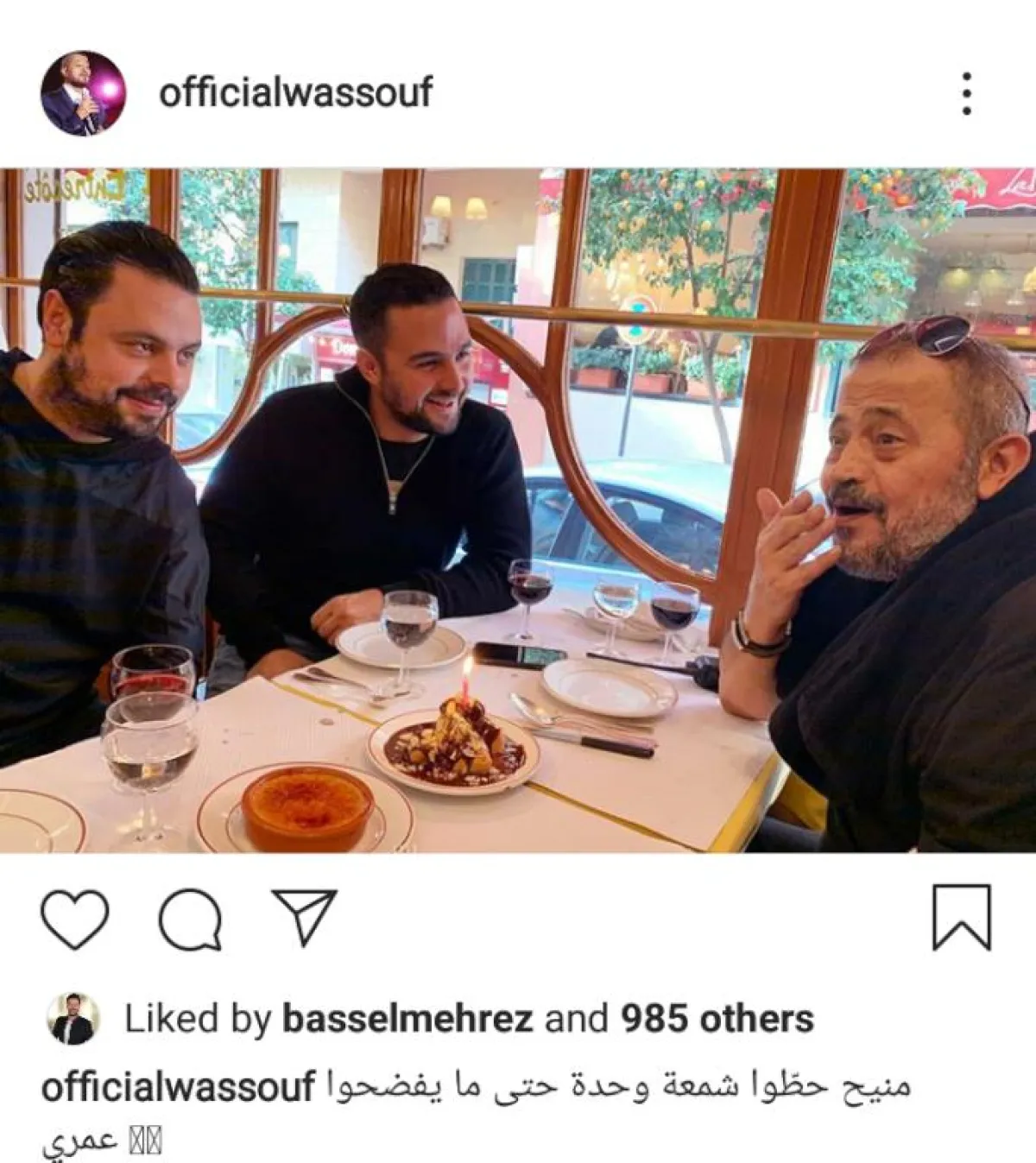 ونشر الوسوف صورة له مع حاتم وجورج جونيور وهم يجلسون أمام كعكة عيد ميلاده المزينة بشمعة واحدة معلقاً"منيح حطوا شمعة واحدة حتى ما يفضحوا عمري".