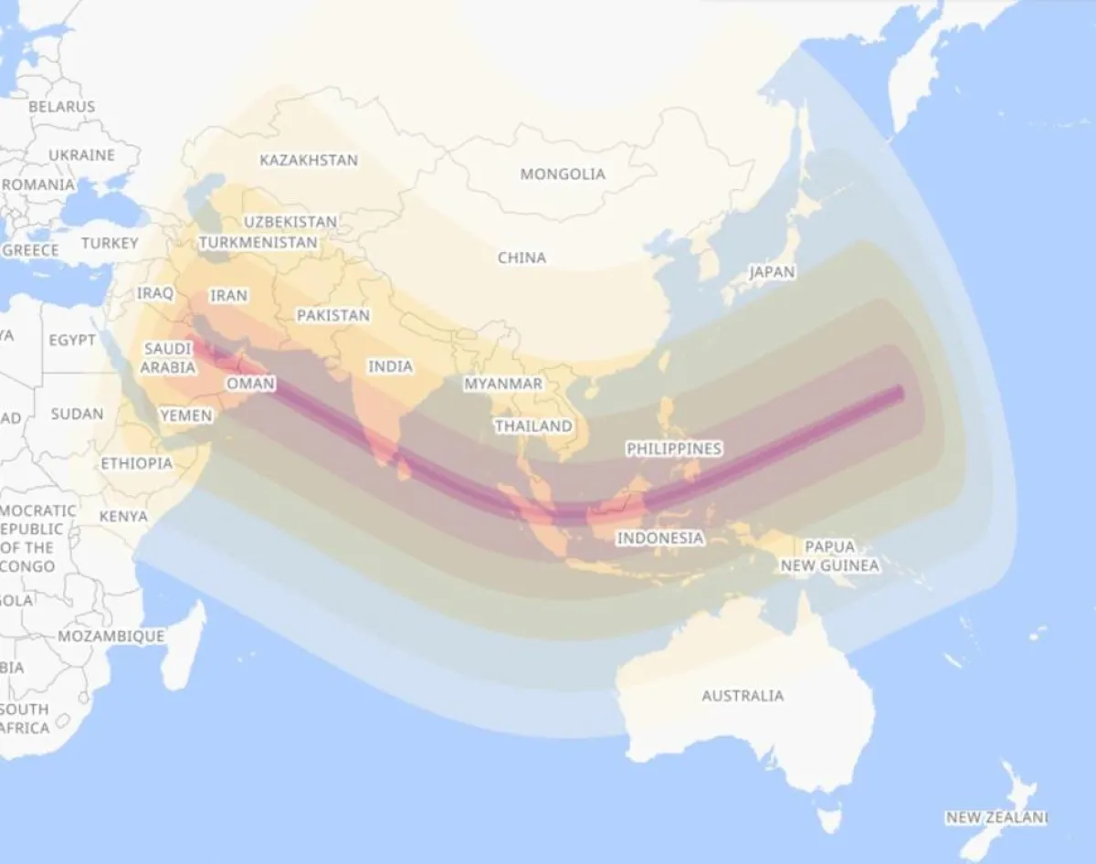 وواصل المسند تفسير هذه الحالة موضحاً: "سيُشاهد كسوف شمسي حلقي في أجزاءٍ من السعودية والإمارات وعُمان والهند وسريلانكا وإندونيسيا وسنغافورة، حيث سيحجب جرم القمر قرص الشمس بنسبة 97% في ذروته وذلك في جزيرة سومطرة الإندونيسية، والـ 3% المتبقية ستظهر على هيئة حلقة مضيئة تُطوّق القمر"