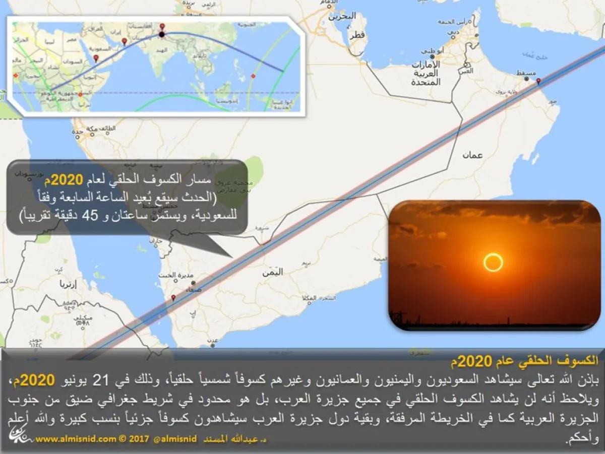وأضاف أن : "السعوديون سيشاهدون كسوفين حلقيين بينهما فقط 6 أشهر: الأول، لم يحدث منذ 97 سنة، سيقع الخميس المقبل 26 ديسمبر شرق #السعودية، والآخر في 21 يونيو 2020 أقصى جنوب السعودية، وهو أعظم ظلمة من الأول، وهو آخر كسوف حلقي سيشاهده السعوديون الذين تبلغ أعمارهم 70 سنة فما فوق، والله أعلم".