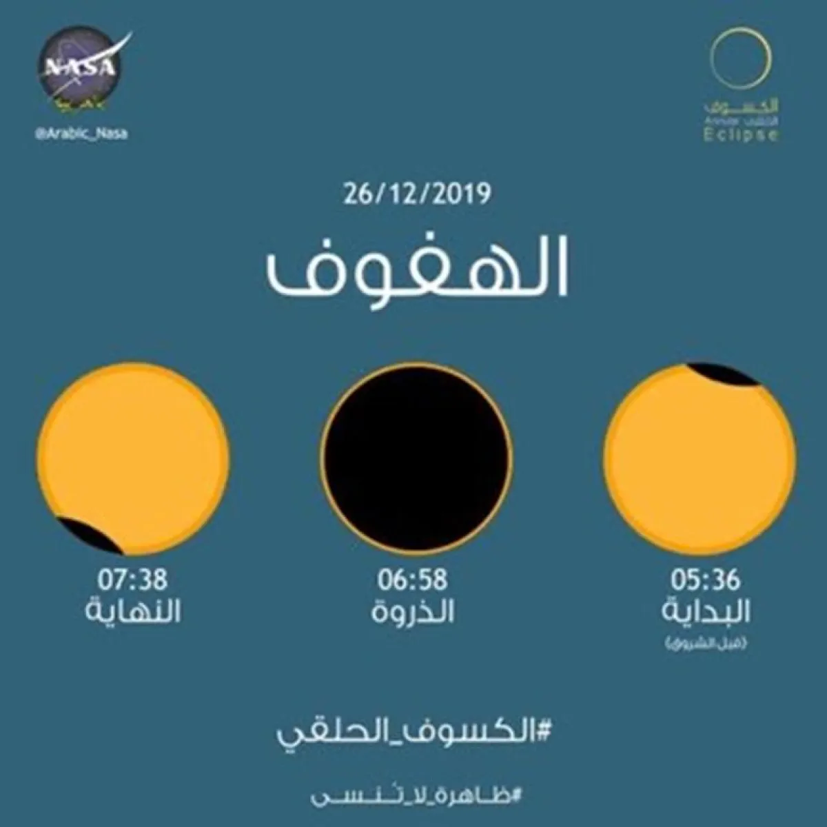 يقول: "في الهفوف سيشاهد كسوف حلقي بنسبة91%، ستشرق الشمس وهي كاسفة جزئياً 06:28، بداية الكسوف الحلقي 06:35، نهايته 07:37، ونهاية الجزئي 07:48، وطول فترة الحلقي دقيقتين 55 ثانية، وطول الجزئي 01:20".