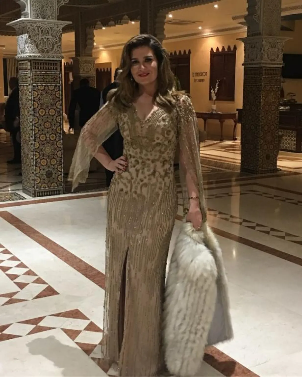 إحدى أجمل اطلالات هنا شيحة على مر السنوات من دون شك، كانت في هذا الفستان الأسود الذي اختارته بقصة ضيقة مكشوفة الأكتاف، محدد الخصر بحزام من الساتان، وتنورته من الأسفل مزينة بالريش بطريقة أنيقة، وقد أحسنت تزيينه بعقد ماسي مرصع بحجر أخضر، كذلك فإنّ تسريحة الشعر والمكياج كانا مناسبين.