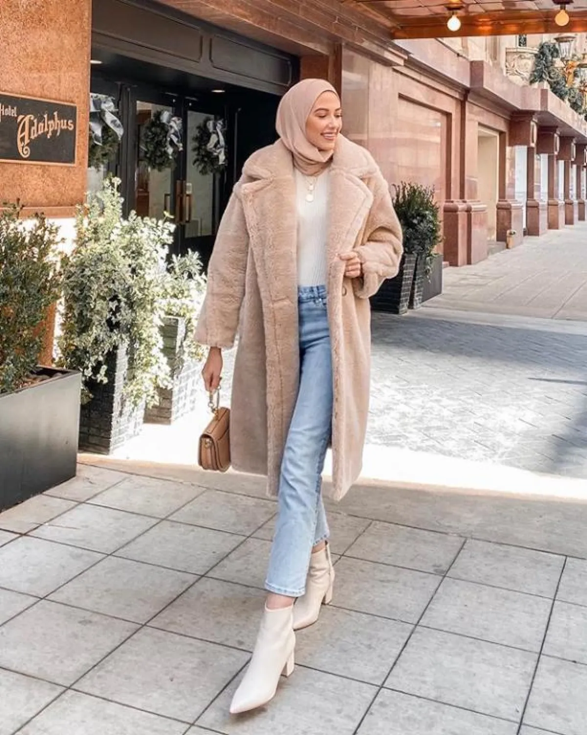 تعتمد مدونة الموضة العالمية لينا أسعد هذا الستايل للمعاطف الفرو الطويلة بشكل كبير، بخاصة مع كثرة السفر والترحال للمدن الثلجية، وتُنسق المعطف بكل بساطة مع البناطيل الجلد الضيقة، والسكارف، ولفتنا أيضًا اختيارها لقبعة البيريه البيضاء لتبدو متناغمة أكثر مع المعطف.