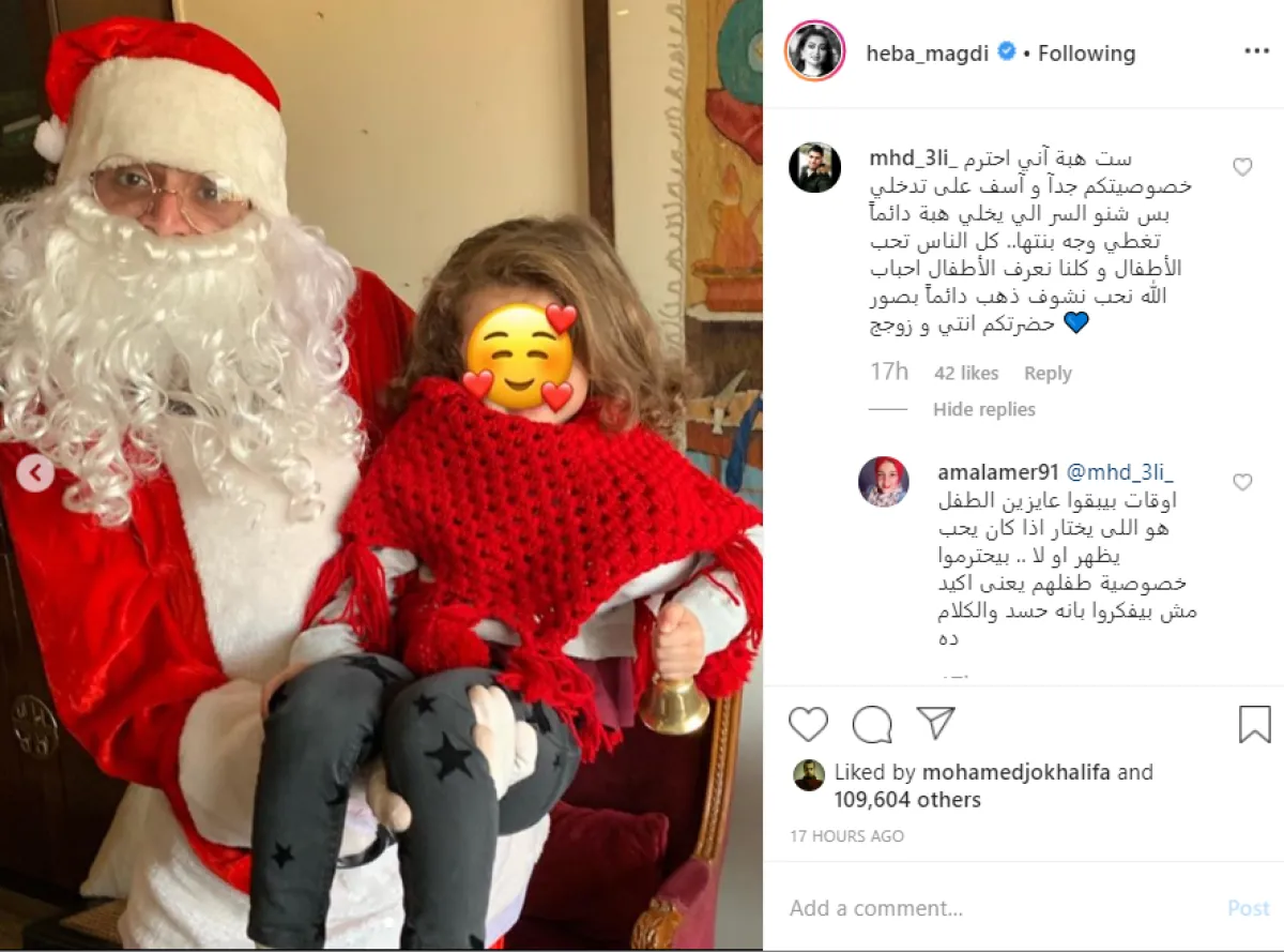 أحد المتابعين لحساب هبة مجدي على إنستقرام افتتح النقاش بتعليق مطول أبدى فيه غضبه من حرصها على إخفاء وجه ابنتها قائلا: ست هبة أنا أحترم خصوصيتكم جدًا وآسف إني أتدخل بس شنو السر اللي يخلي هبة دايما تغطي وجه ابنتها .. كل الناس تحب الأطفال وكلنا نعرف الأطفال أحباب الله .. نحب نشوف صورة دهب دايما بصورة حضرتك أنتي وزوجك.