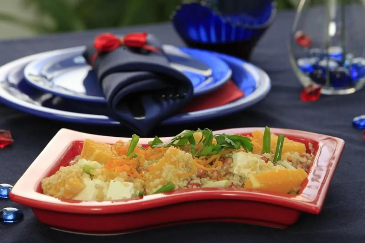 3- في وعاء التقديم، توضع الكينوا مع بذور الرمان وشرائح البرتقال والبصل الأخضر.