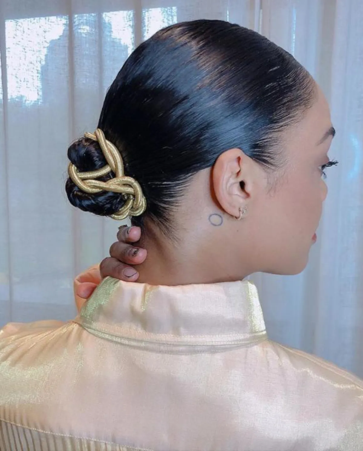 تستحق هذه التسريحة التجربة هذا الشتاء، فهي أنيقة جداً وعصرية وعملية، مما يجعلها مناسبة لمختلف الأوقات. اعتمدي الغرة المشدودة، واسحبي شعرك كله الى الخلف، ولفيه على شكل كعكة منخفضة، من ثم ثبتي الكعكة بالشرائط الذهبية الناعمة. بعدها، رشي القليل من السبراي لتثبيت الشعر وجعل تسريحتك مصقولة بعناية.