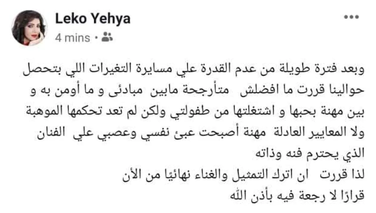 لقاء كتبت رسالة حزينة عبر حسابها الشخصي على موقع الفيس بوك قالت فيها: بعد فترة طويلة من عدم القدرة على مسايرة التغيرات اللي بتحصل حوالينا قررت ما فضلش متأرجحة ما بين مبادئي وما أؤمن به وبين مهنة بحبها واشتغلتها من طفولتي لكن لم تعد تحكمها الموهبة ولا المعايير العادلة مهنة أصبحت عبء نفسي وعصبي على الفنان الذي يحترم فنه وذاته.