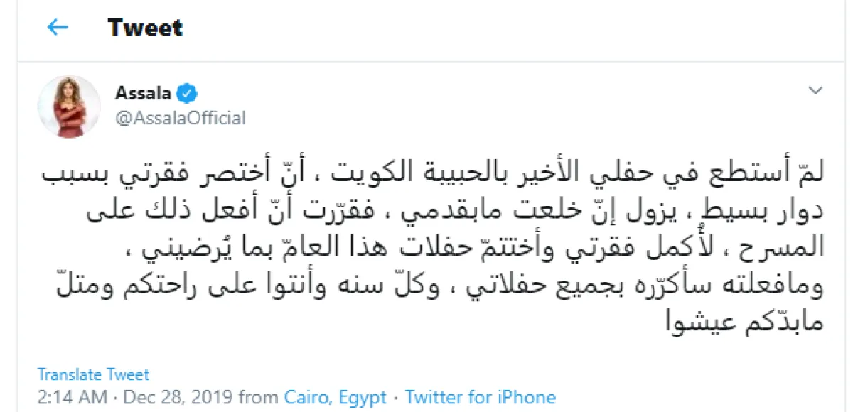 أصالة علقت على الضجة المثارة حول أسباب خلع الحذاء، بتغريدة عبر حسابها الموثق بموقع تويتر قائلة: لمّ أستطع في حفلي الأخير بالحبيبة الكويت، أنّ أختصر فقرتي بسبب دوار بسيط، يزول إنّ خلعت ما بقدمي.