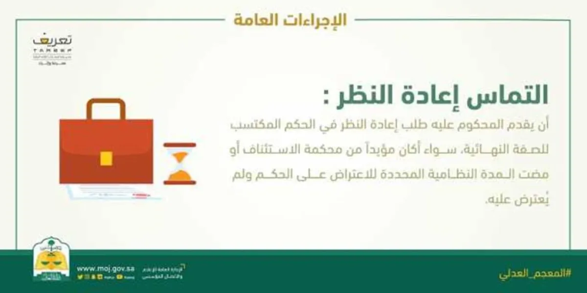 وقال برنامج تعريف التابع لوزارة العدل، في انفوجراف على موقع "تويتر"، إنه بإمكان المحكوم عليه أن يتقدم بطلب إعادة النظر في الحكم المكتسب للصفة النهائية، سواء أكان مؤيدًا من محكمة الاستئناف أو مضت المدة النظامية المحددة للاعتراض على الحكم ولم يعترض عليه.