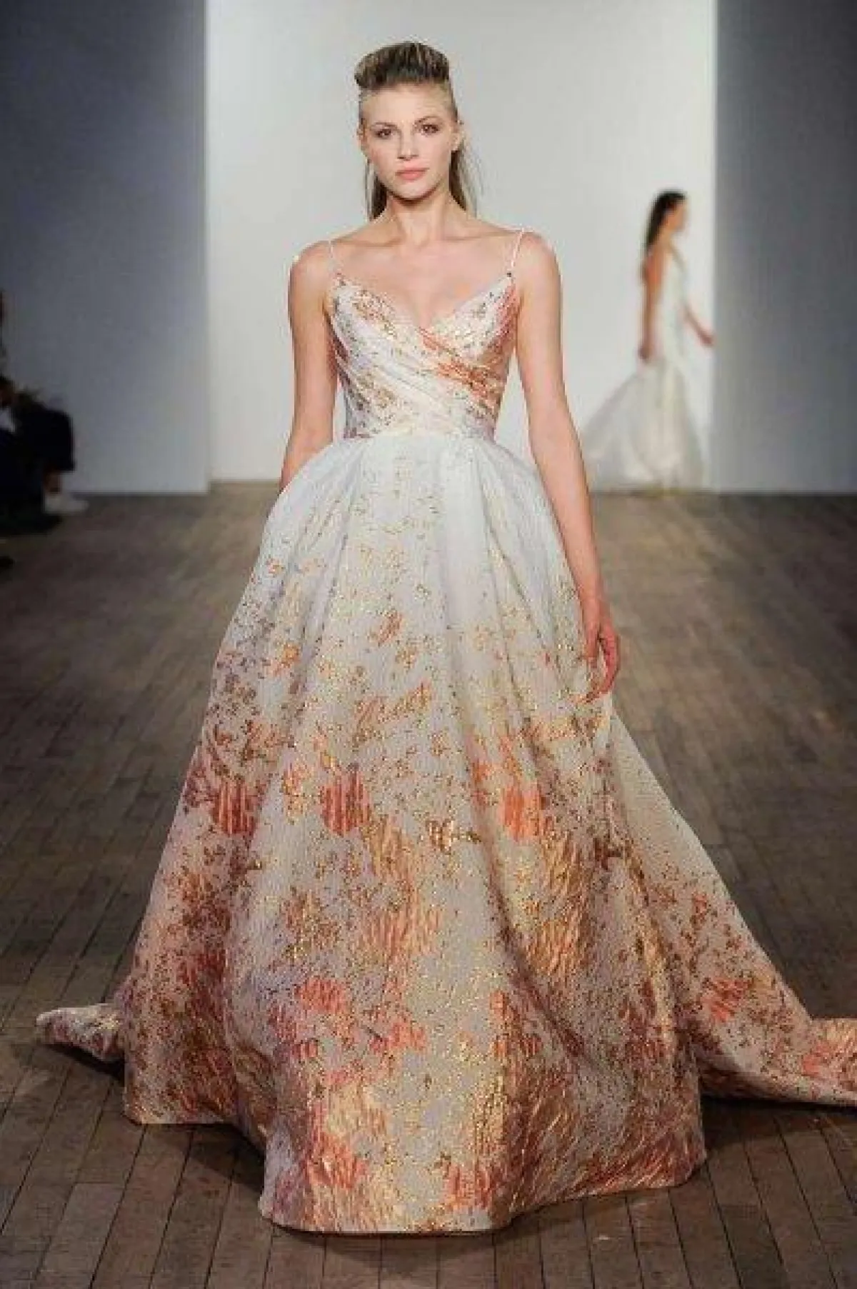 ظهرت بعض موديلات فساتين الخطوبة باللون الذهبي وبتصاميم ناعمة للعروس التي تبحث عن إطلالة عصرية.