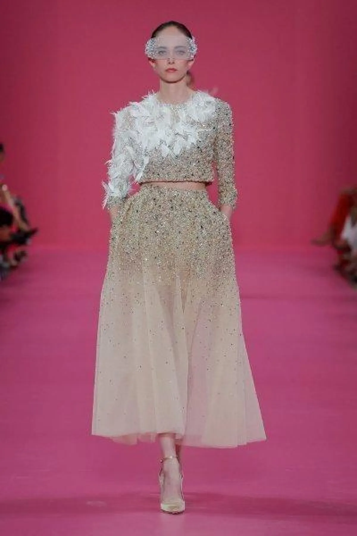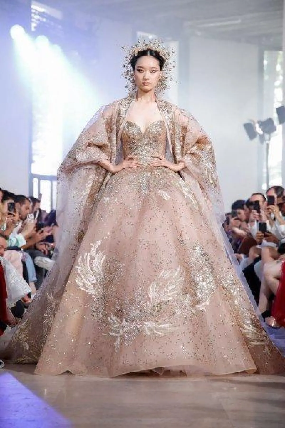 قدم المصمم اللبناني ايلي صعب Elie Saab فستان منفوش للعروس وزاد سحره بتطريزات الذهبي، وهو مزود بسترة إضافية يمكن أن تخلعها العروس خلال الحفل.