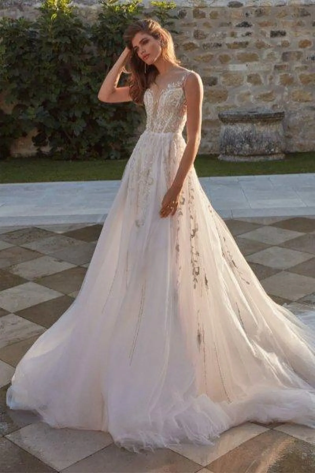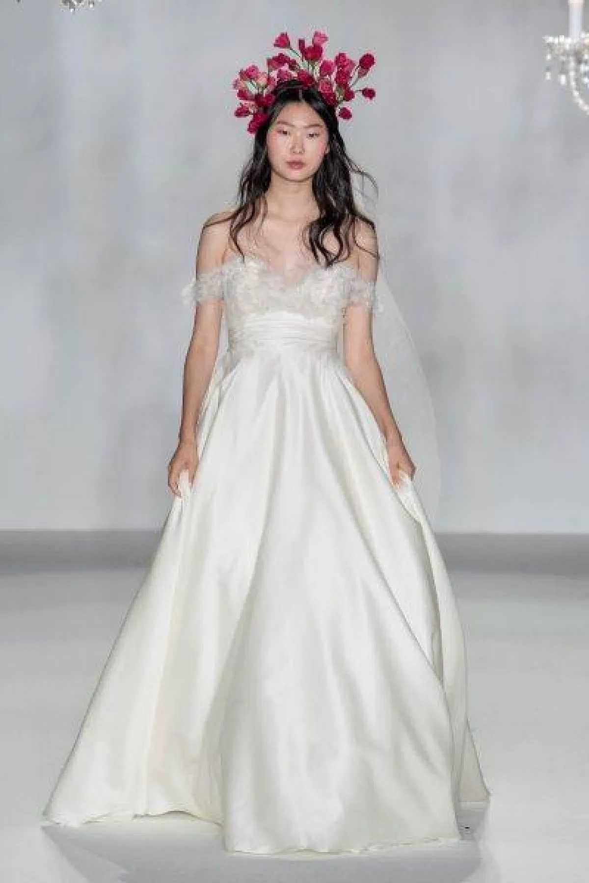 أيضاً قدمت ماركة Galia Lahav فستان زفاف منفوش بتنورة تول ومرصع بتطريزات الورود، وهو بحمّالات ومزود بذيل طويل.