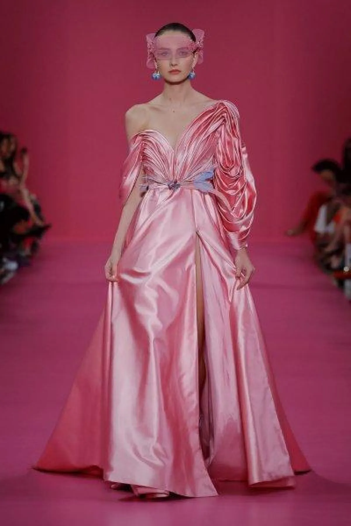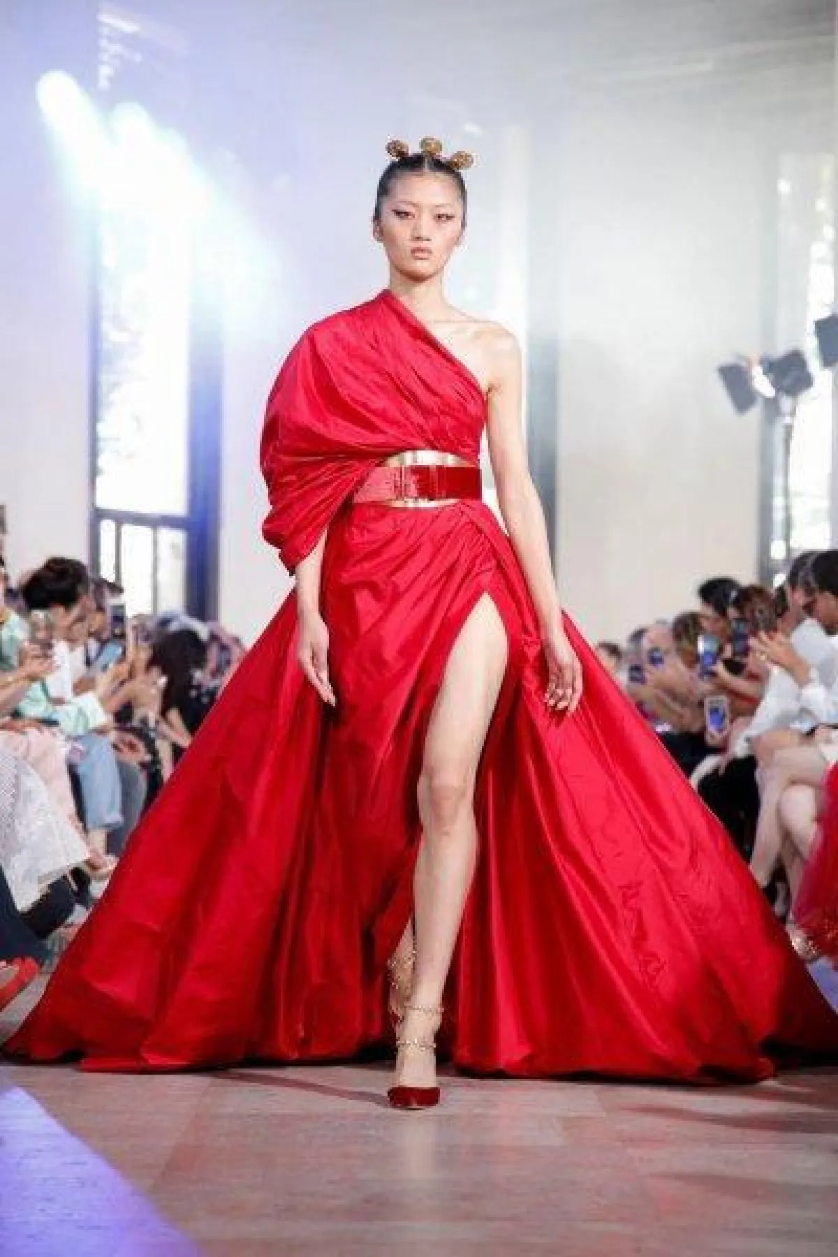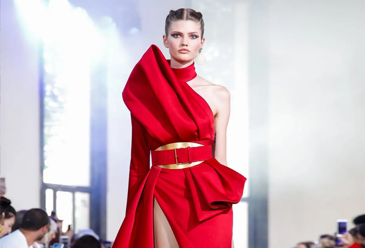 وبالإضافة إلى صيحة الكم الواحد، قدم المصمم صيحات أخرى عصرية بالفساتين، مثل صيحة الشق الأمامي الطويل وصيحة الفساتين المزينة بأحزمة حول الخصر.