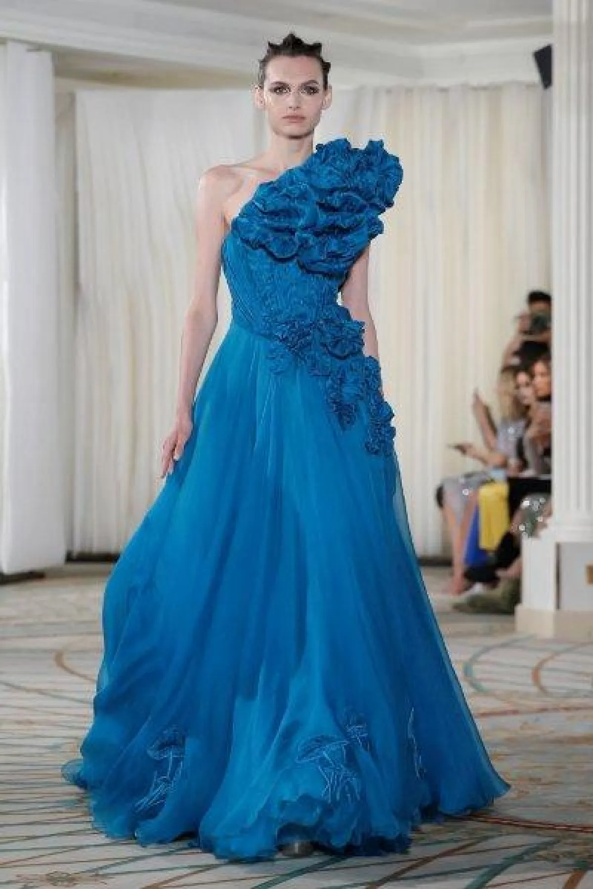 قدم المصمم اللبناني طوني ورد فساتين خطوبة بكتف واحد باللون الأزرق مع كشاكش تزين الكتف. أحدهما بقماش شفاف والآخر بقماش مزين بالغليتر البرّاق مع شق أمامي طويل.