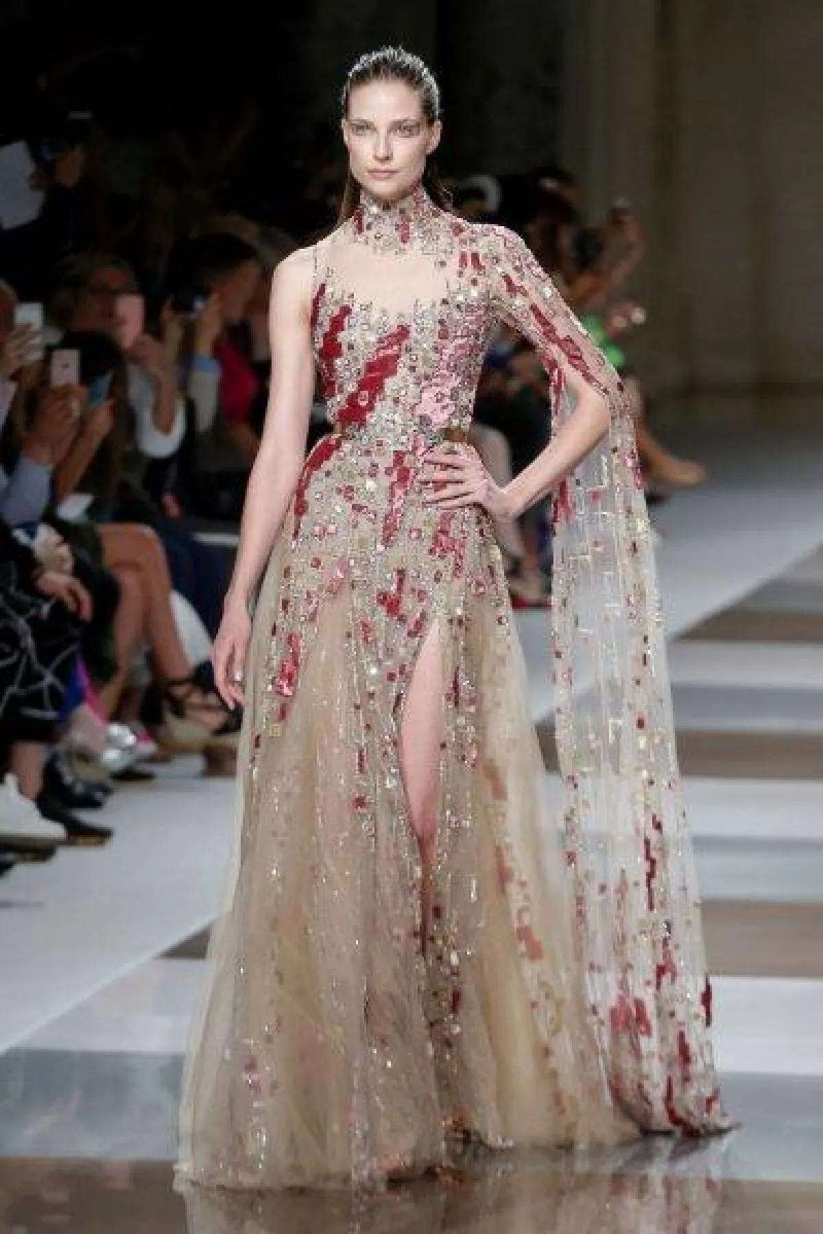 وسيطرت الألوان النابضة بالحيوية على فساتين ايلي صعب، مثل اللون الأحمر والأخضر والأزرق بدرجاتها القوية، فضلاً عن الألوان المعدنية على الأقمشة الشفافة مثل الذهبي والفضي.