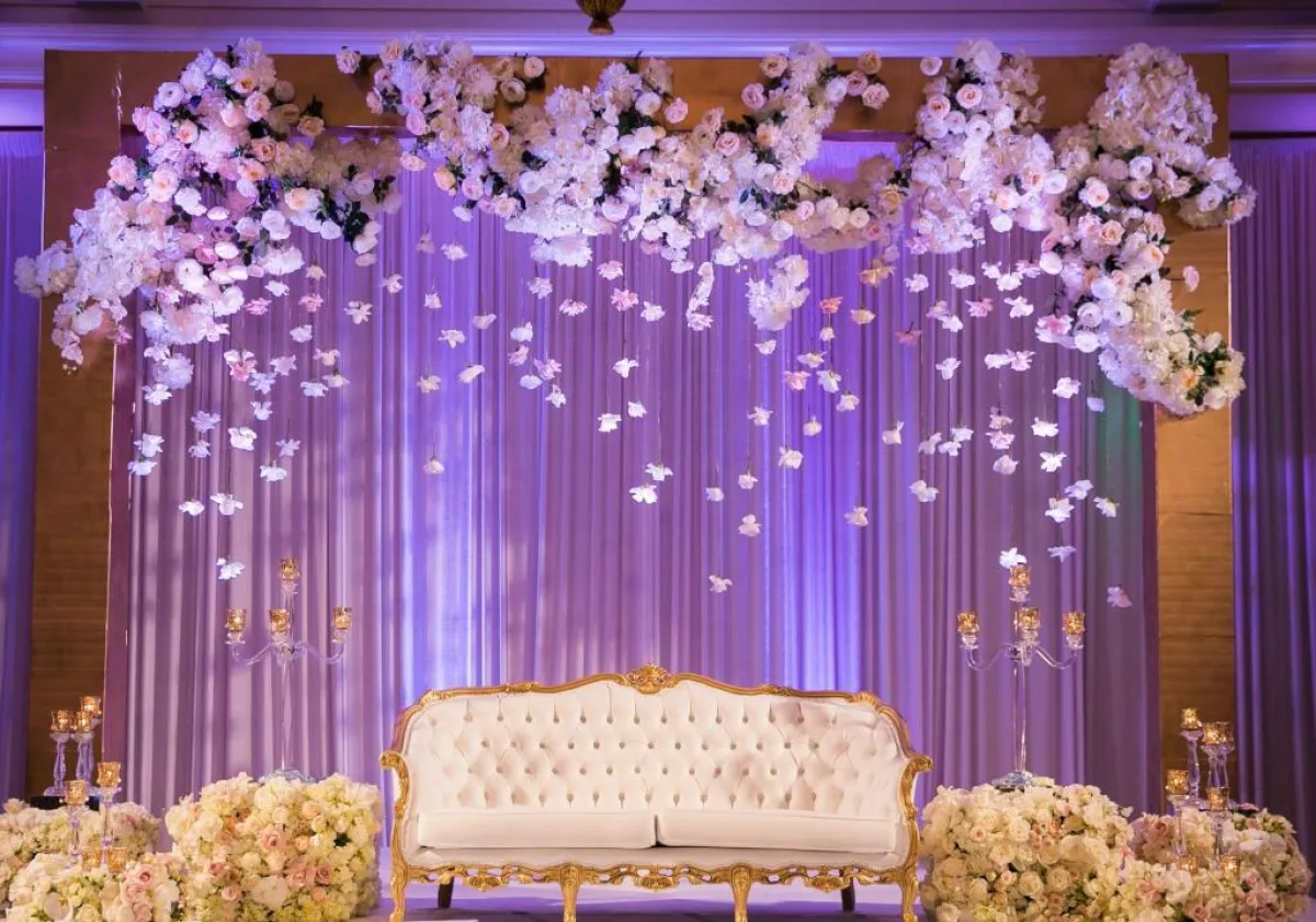 ديكور كوشة الزفاف مع خلفية الستائر