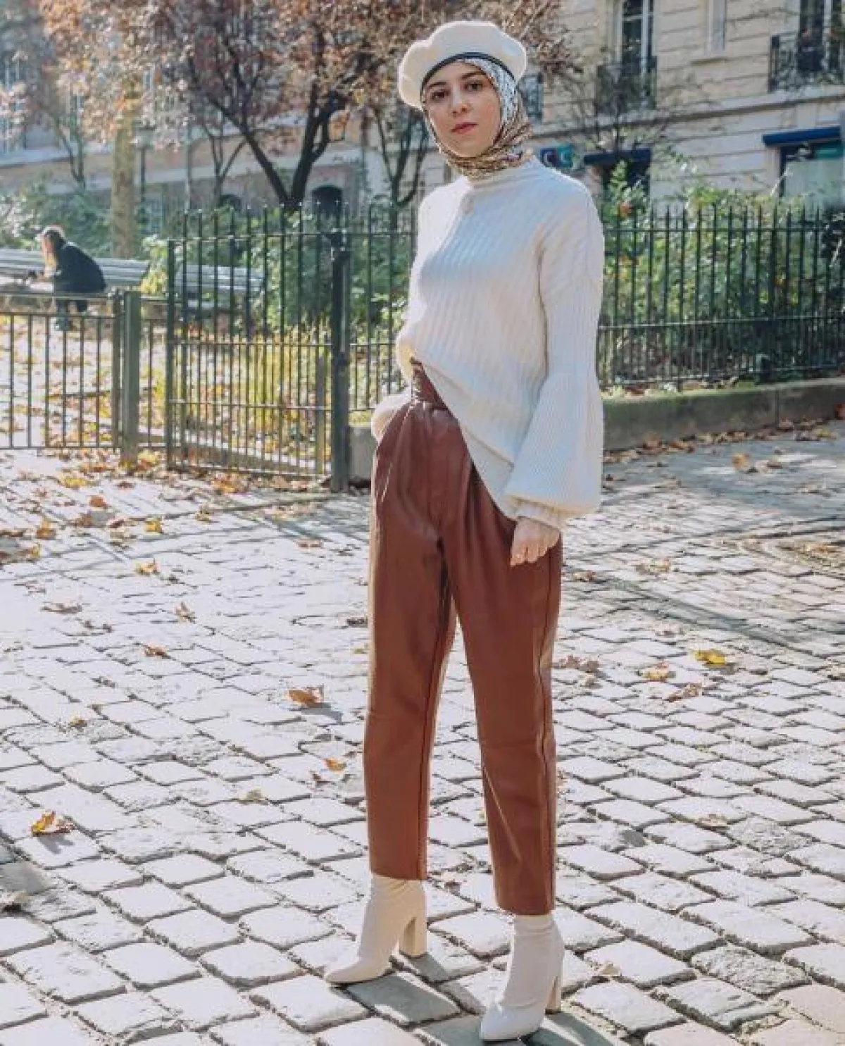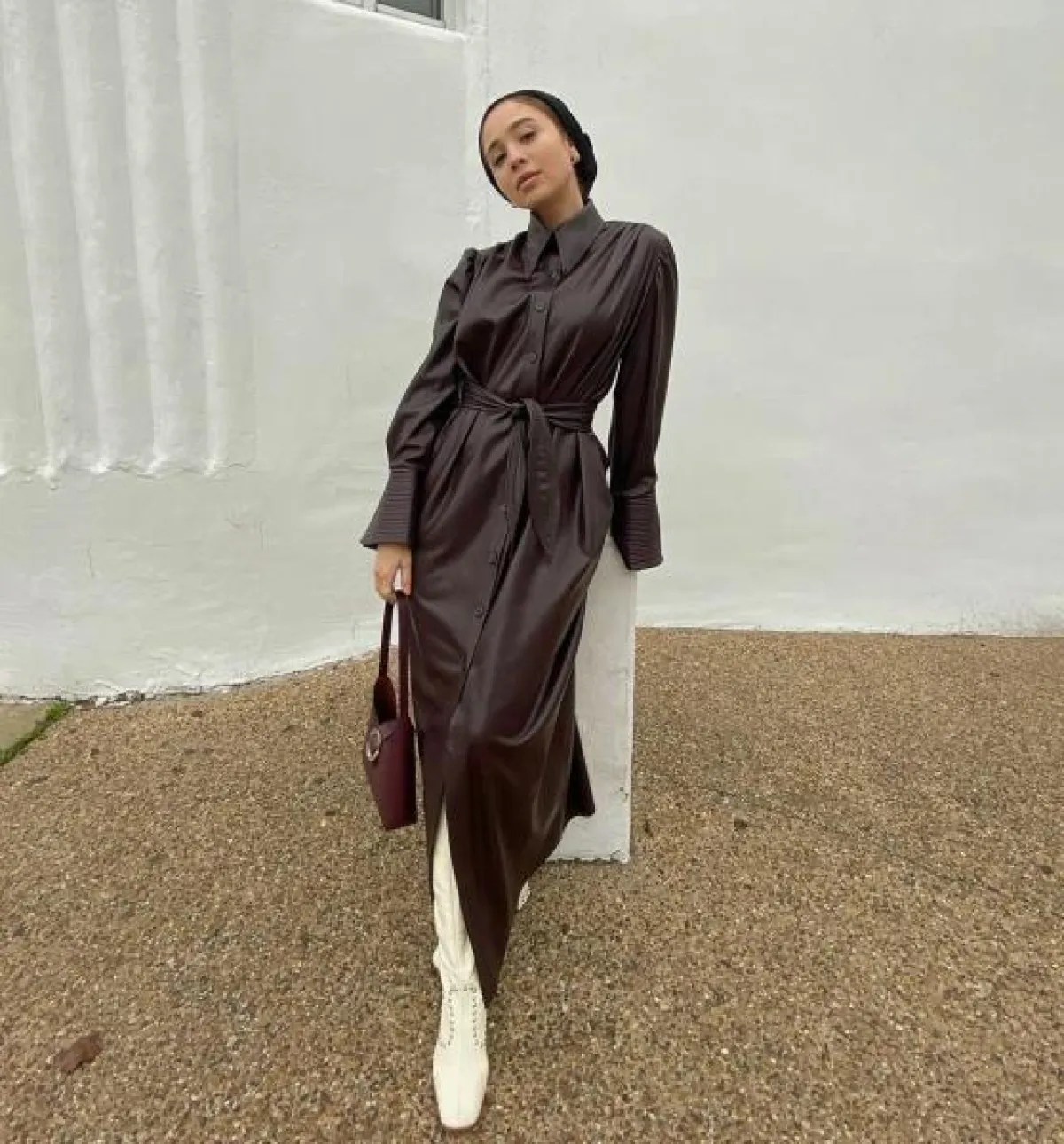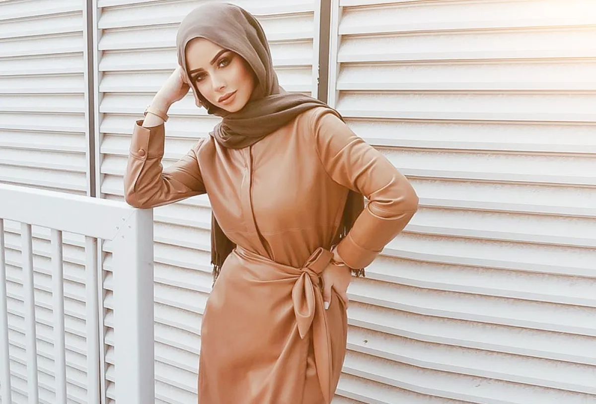 تعد الفساتين الجلد من أبرز إتجاهات موضة شتاء 2020، القصات الواسعة جعلتها قطع تناسب اطلالات المحجبات، اختاري فستان بني طويل بموديل القميص Shirt dress ونسقيه مع حقيبة كتف متوسطة الحجم من اللون نفسه وأنتعلي بوت أبيض طويل أو أعتمدي الفستان الجملي بقصة الـ Wrap على غرار الفاشينيستا سها وأعتمري طرحة بنية اللون.