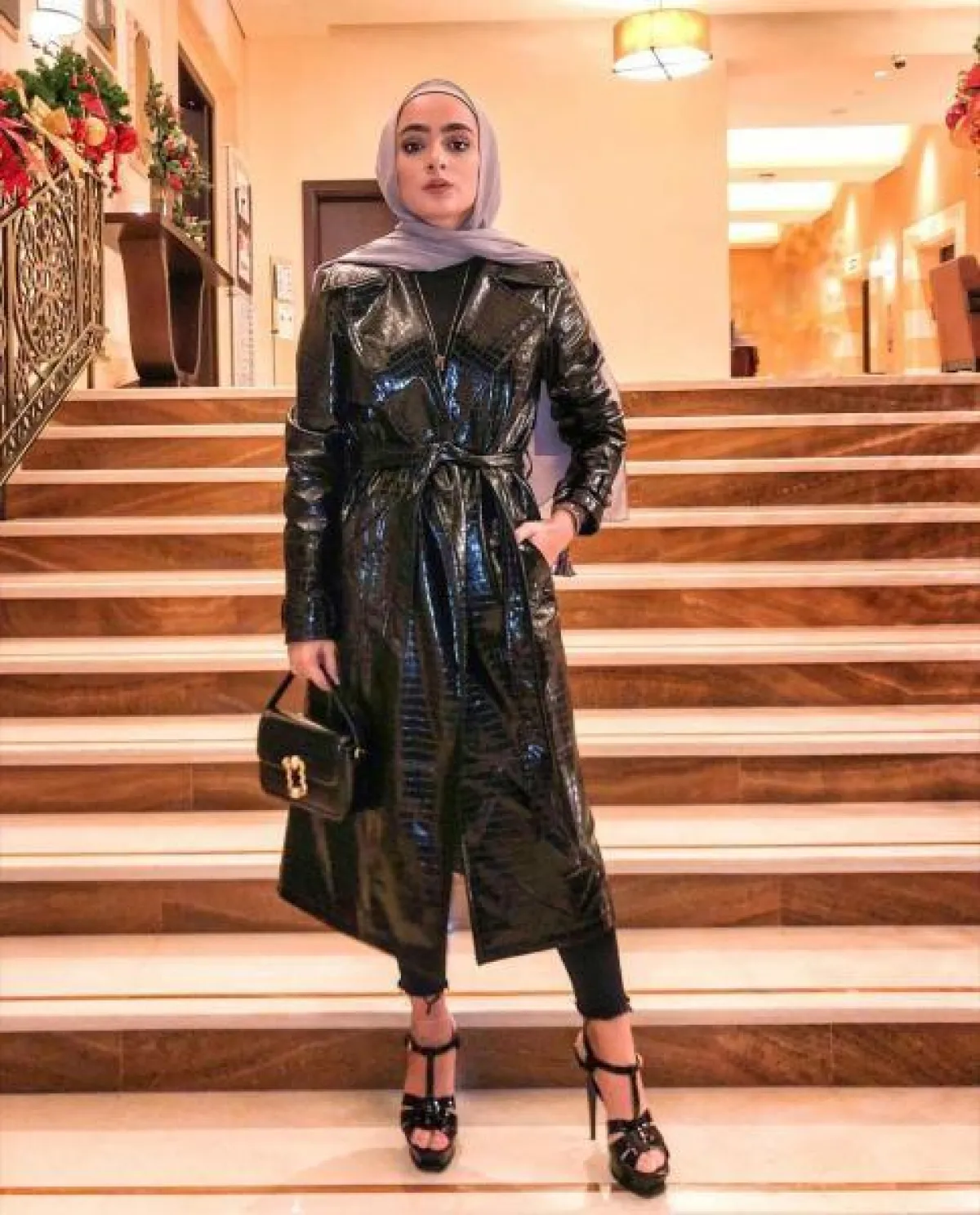 خلاف فخامتها ستؤمن لكِ المعاطف الجلد الدفء والحماية من الأمطار، جربي تنسيقها في المساء مع بنطال أسود Skinny وتوب أسود وزيني رأسك بطرحة شيفون باللون الرمادي وأنتعلي حذاء بكعب رفيع ليزيد من طولك.