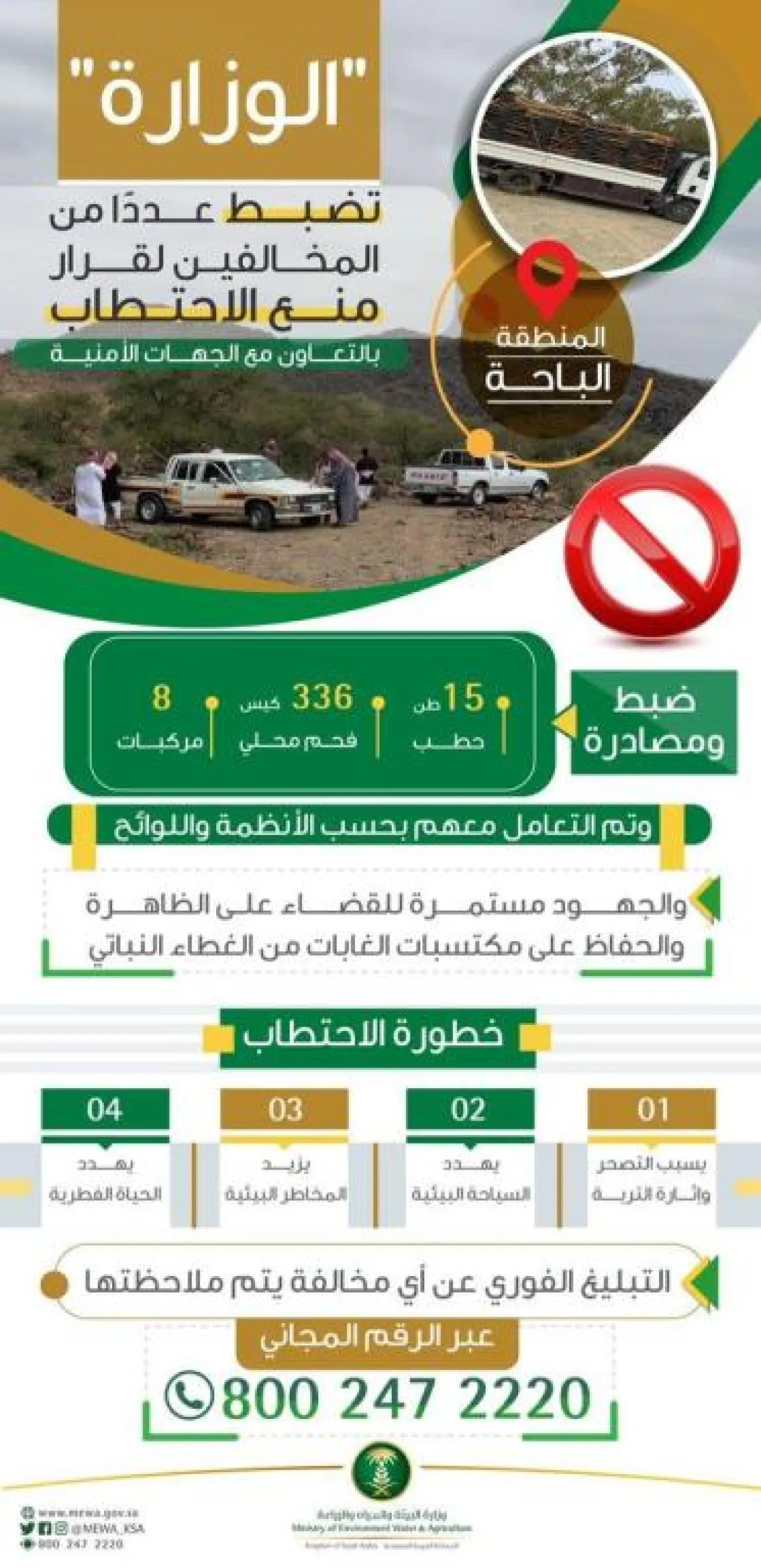 ضبطت وزارة البيئة والمياه والزراعة يوم الاثنين عددًا من مخالفي قرار منع الاحتطاب وبحوزتهم 15 طنًّا من الأشجار المحلية محمّلة على 8 سيارات في الباحة.