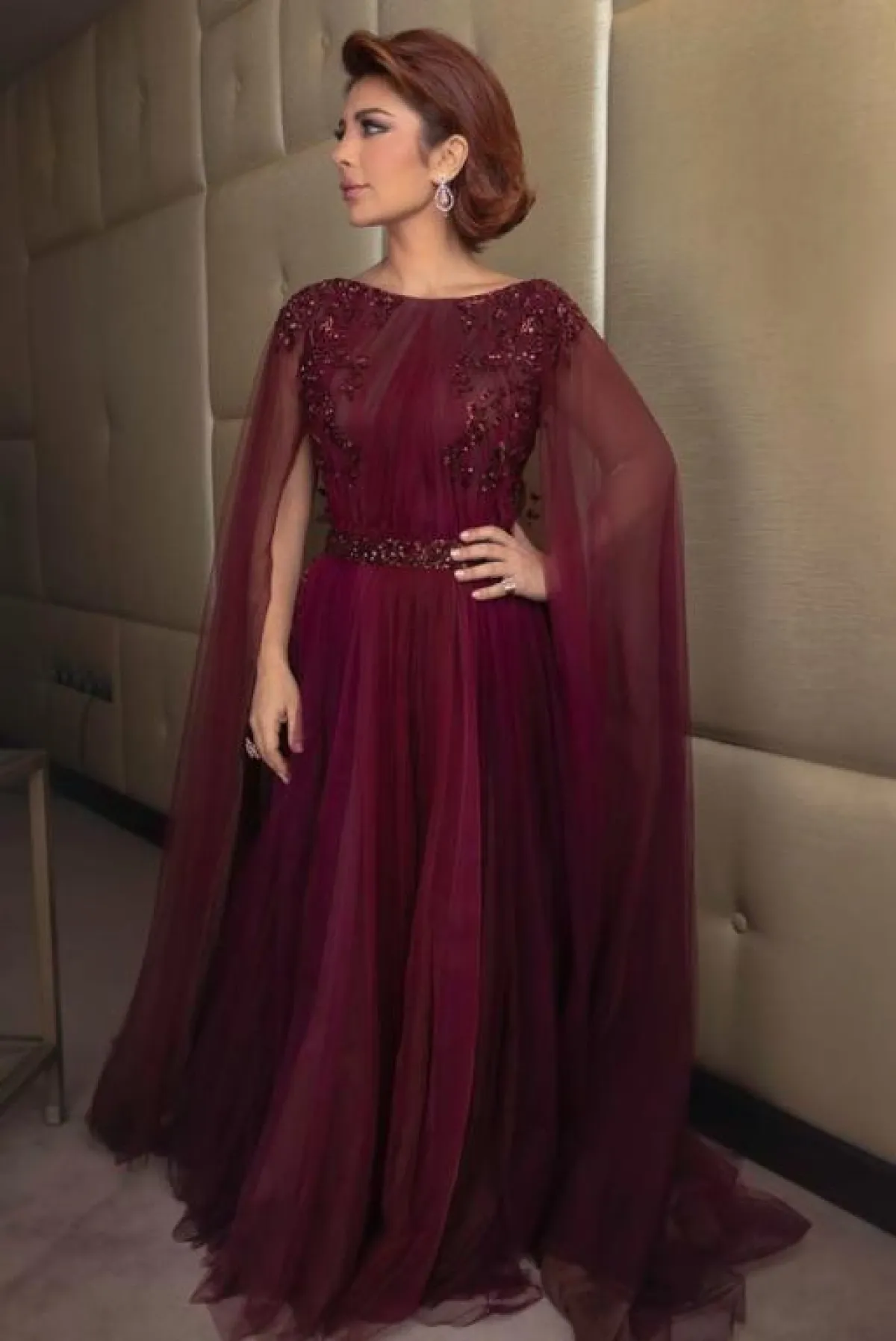 إطلالة مشرقة في فستان باللون العنابي: