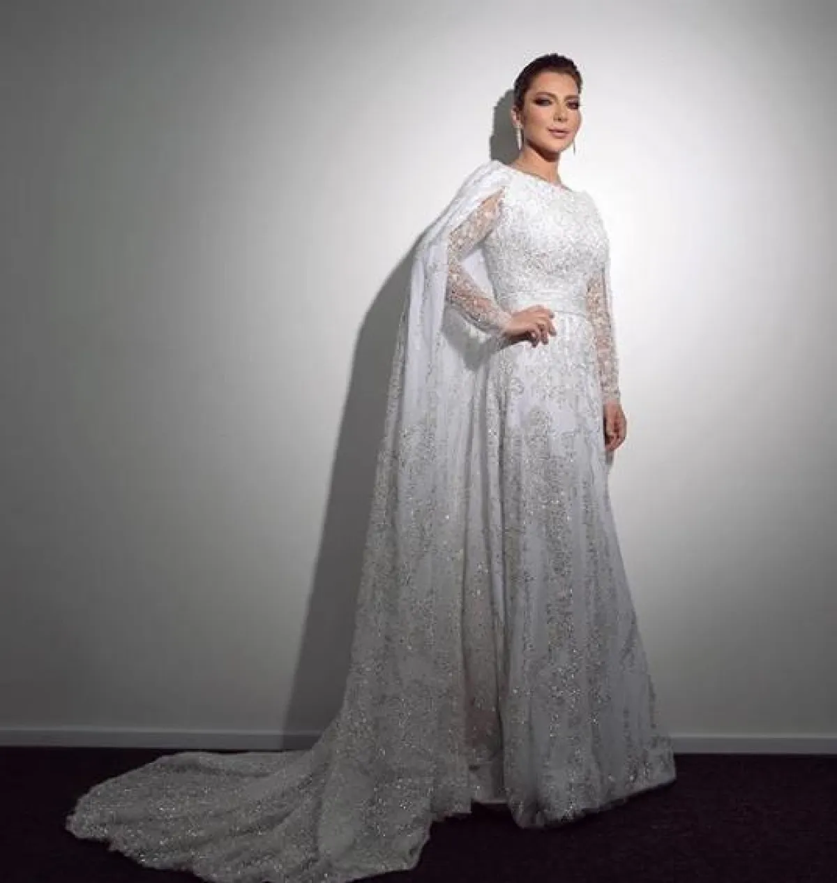في حفل أحيته أصالة نصري مؤخراً في السعودية، اختارت إطلالة فاخرة أيضاً حملت توقيع نيكولا جبران Nicolas Jebran بدت فيها غاية في الأناقة، وكانت إحدى أجمل إطلالاتها لهذا العام في فستان من قماش الشيفون الأبيض المطرز بالخرز والكريستال البراق، خصره محدد مع كاب طويل، وقد اعتمدت معه أقراطا ماسية وتسريحة شعر مشدودة إلى الخلف.