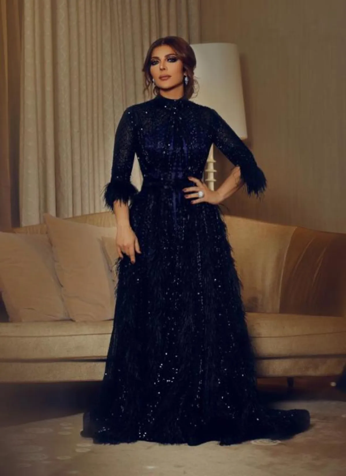 تعودنا على إطلالات أصالة المميزة التي حملت توقيع نيكولا جبران Nicolas Jebran لكنها أيضاً كانت موفقة في خيارها الذي اعتمدته من دار لابورجوازي هذا العام، في فستان سهرة باللون الأزرق الكحلي، مشكوك بحبات الكريستال البراقة ومزين بطريقة ناعمة بالريش على الأكمام، وقد زينته بمجوهرات ماسية أضافت من خلالها لمسات فخمة على اللوك.