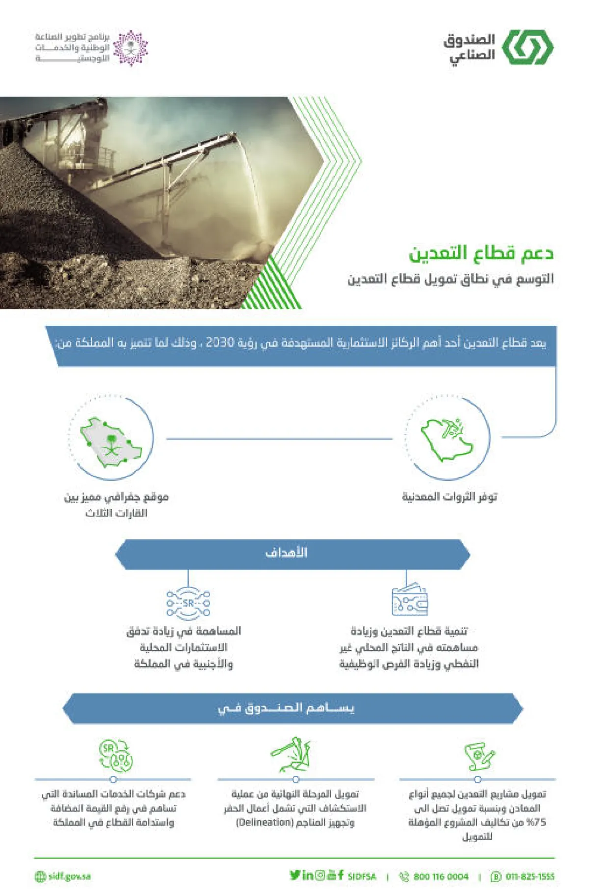 أعلن صندوق التنمية الصناعية السعودي عن توسعه في نطاق تمويل قطاع التعدين، والذي يُعد أحد القطاعات الرئيسة التي يمولها الصندوق إلى جانب قطاعات الصناعة والطاقة والخدمات اللوجستية، تأكيداً لدوره كممكن مالي رئيس لبرنامج تطوير الصناعة الوطنية والخدمات اللوجستية (ندلب)،وتهدف سياسة دعم قطاع التعدين للصندوق الصناعي إلى تنمية القطاع، وزيادة مساهمته في الناتج المحلي غير النفطي، وزيادة الفرص الوظيفية، والمساهمة في زيادة تدفق الاستثمارات المحلية والأجنبية في المملكة. حيث يعد قطاع التعدين إحدى أهم الركائز الاستثمارية المستهدفة في رؤية 2030، لما تتميز به المملكة من ثروات معدنية وموقع جغرافي للربط بين القارات الثلاث.