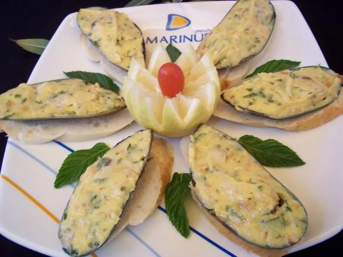 4-وللتقديم:يقطّع خبز "الباغيت" إلى شرائح متساوية، توضع فوق كل منها حبّة من بلح البحر المحشو، ثم تدخل هذه الشرائح إلى الفرن على نار متوسطة لـ5 دقائق.