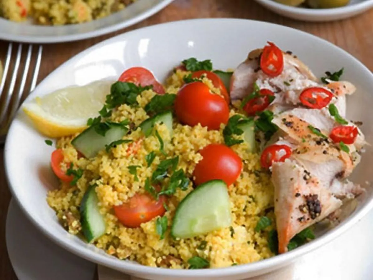 4 - تُسلق البازيلاء على البخار ومن ثم توضع في وعاء كبير، يضاف إليها الفلفل الأخضر، قطع الدجاج والزبيب. يخلط هذا المزيج ويوضع فوق الكسكس. ويترك في الثلاجة لمدة ساعة حتى يبرد.