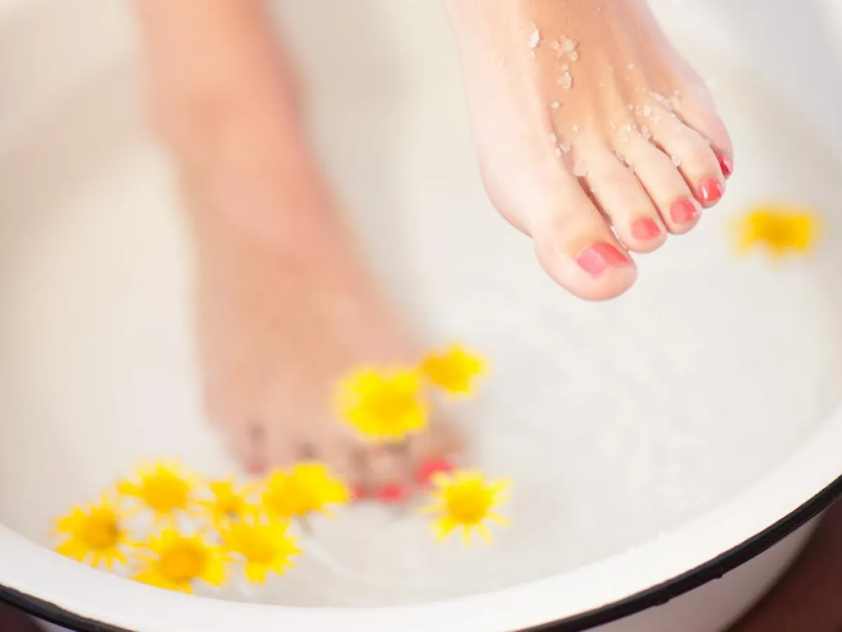 1. ضعي قدميكِ في إناء كبير مملوء حتى المنتصف بالماء السَّاخن، قدر تحمُّلك، مع ضرورة إبقاء القليل من الماء الساخن بجانبكِ، لإضافته إلى الإناء، كلَّما شعرتِ بانخفاض سخونة الماء.