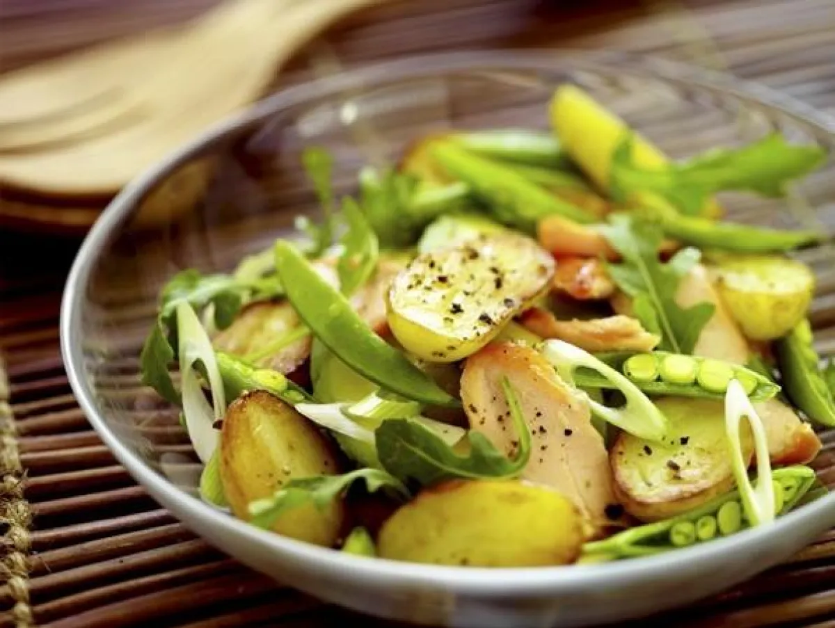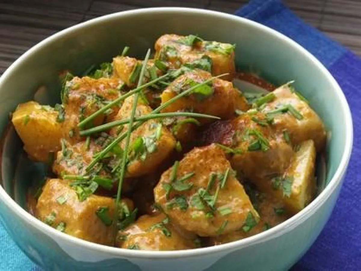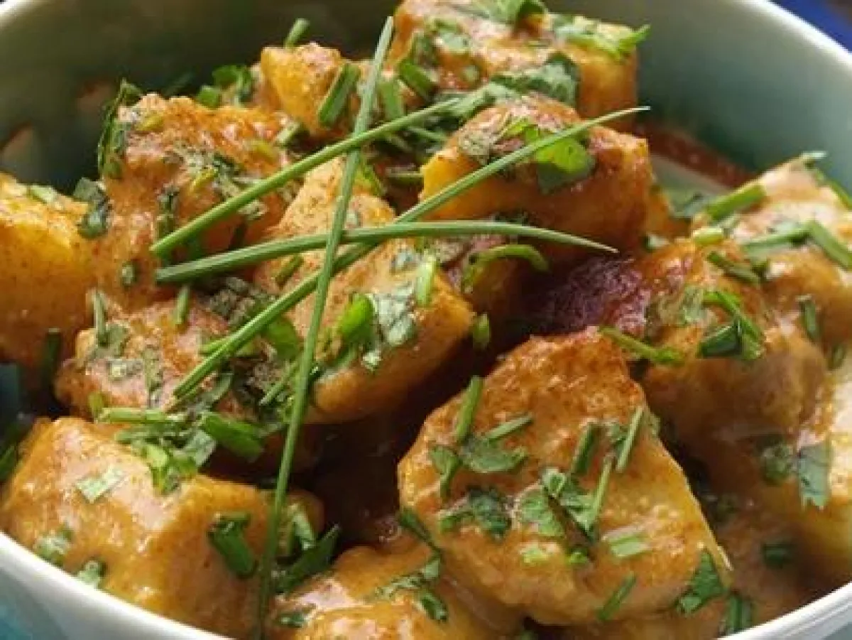 1- تُقطع البطاطس إلى مكعبات كبيرة. وتوضع في وعاء مخصص للسلطة. يضاف إليها البصل المقطع.