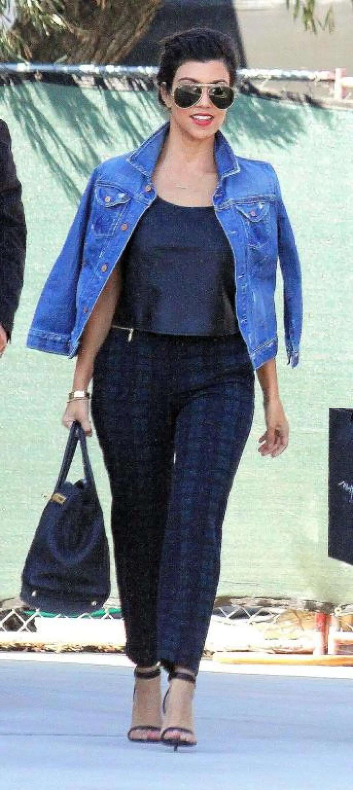 اشتهرت كورتني بأنَّها الأكثر أناقة بين الأخوات الثلاث، وقد اختارت في هذا اللوك بنطلوناً رائعاً بطبعة مربعات جميلة، ونسَّقته بطريقة عصريَّة مع توب أسود عادي وجاكيت جينز مميَّز، كما اختارت اللون الأسود لإكسسواراتها بحقيبة وحذاء مميَّزين.